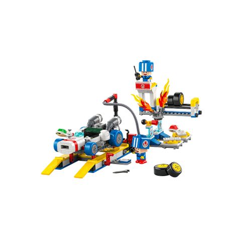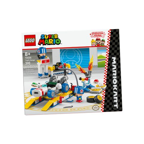 Dive into the exciting world of Mario Kart with the LEGO Super Mario: Mario Kart Toad's Garage (72035) building set. This detailed 390-piece kit allows children ages 8 and up to role-play as part of the pit crew preparing the iconic B Dasher kart for racing action. The set includes two Blue Toad figures in blue pit crew uniforms, a working car elevator, and a variety of tools and accessories to customize the kart. Kids can swap between standard and blue standard tires and add features like a horn or engine from the customization machines to personalize their racing experience. The B Dasher kart is equipped with a shell shooter for added play value. For enhanced interactive fun, LEGO Mario, Luigi, or Peach figures (sold separately) can be placed on the kart or action tags to trigger digital reactions such as driving, drifting, and hovering sounds. Building instructions are provided both in printed form and digitally via the LEGO Builder app, which offers 3D viewing tools to enrich the creative process. This set encourages imaginative play, fine motor skills development, and is an excellent addition for collectors and fans of the Super Mario series.