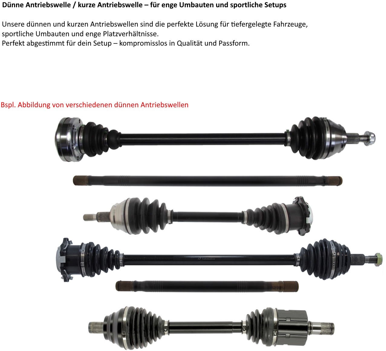 Mit unserer deutlich dünneren und extrem stabilen Antriebswelle ist kein Umbau an der Karosserie notwendig, wenn das Fahrzeug tiefergelegt wird.