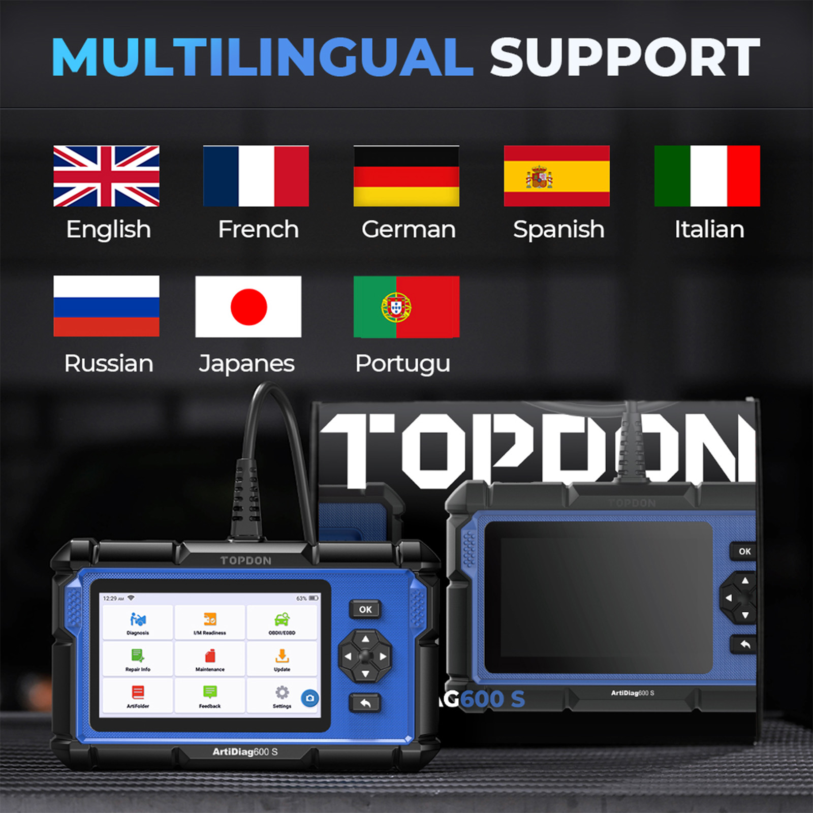 As you’d expect from a top scan tool model, this TOPDON AD600S OBDII code reader also has a multilingual menu feature. You are free to change to a language you would understand better between French, German, Spanish, Portuguese, Russian, Japanese, and Italian with English being the default.