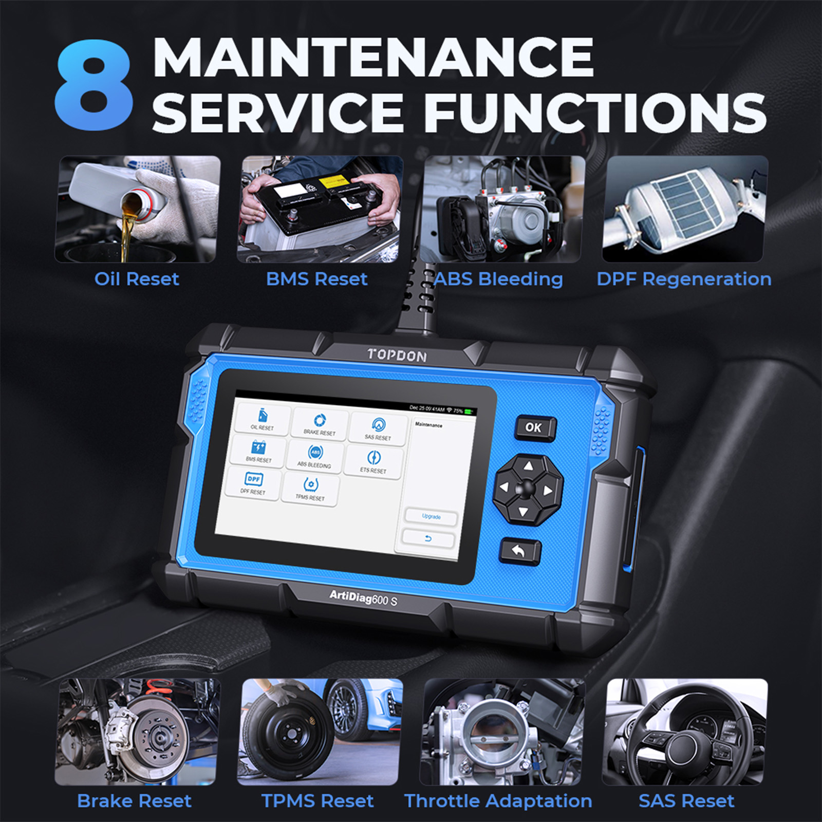 8 Hot Services: for Oil/BMS/ABS/D-P-F/TPMS/SAS/Brake Resets and Throttle Adaptation; covering your daily maintenance needs for a fleet of worldwide vehicles.