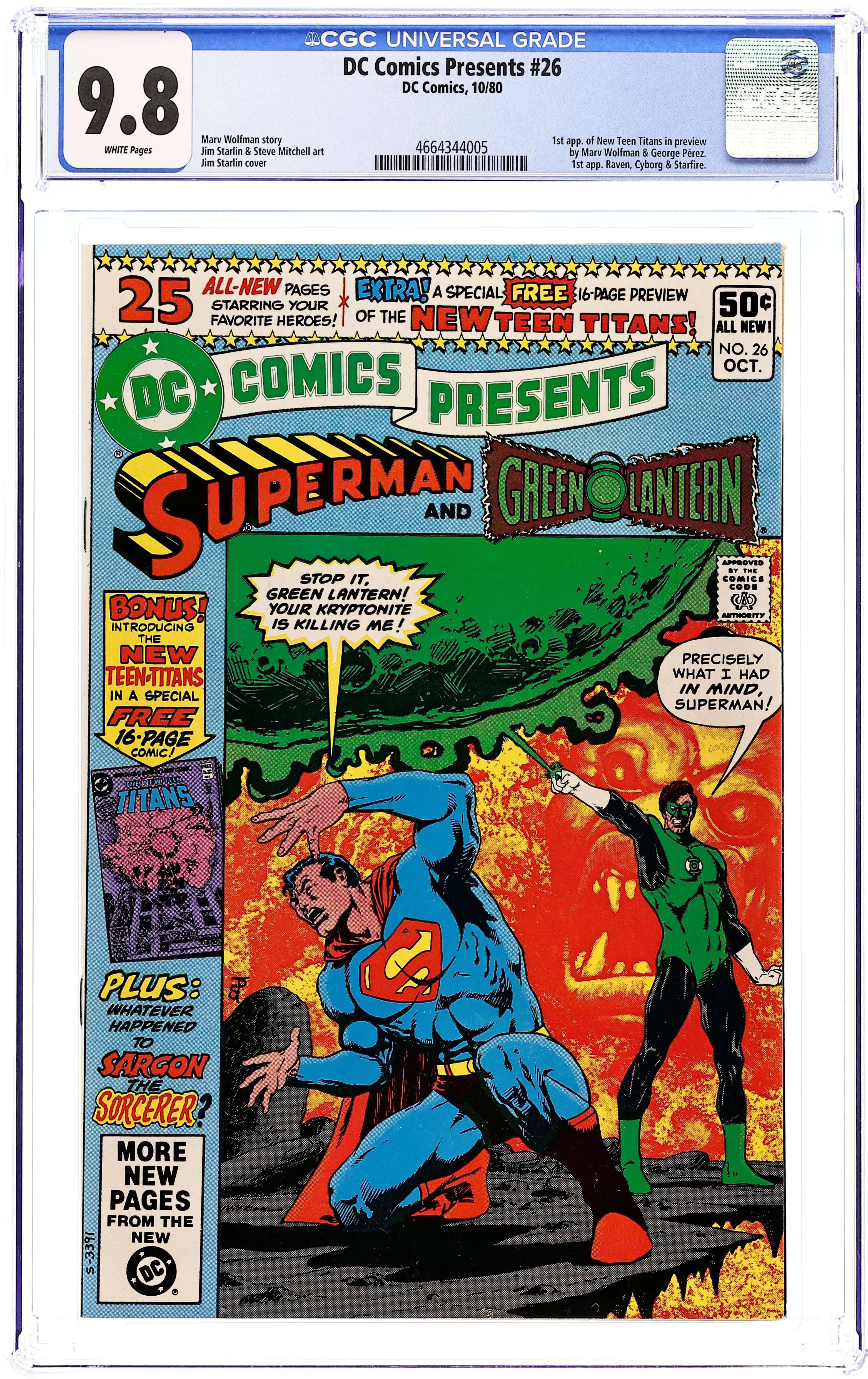 Direct Edition. 1st appearance of the New Teen Titans in preview story; 1st appearances of Raven, Cyborg and Starfire. Cover by Jim Starlin. Stories by Jim Starlin, Marv Wolfman and Bob Rozakis. Art by Jim Starlin, George Pérez, José Delbo, Steve Mitchell, Dick Giordano and Kim DeMulder. N'Gon is attempting to gain power by taking it from other super-beings, but Superman and Green Lantern combine forces to imprison N'Gon in "Between Friend and Foe!" by Jim Starlin (plot and pencils), Marv Wolfman (script) and Steve Mitchell (inks). Characters in this story: Green Lantern [Hal Jordan]; Superman [Clark Kent]; Green Lantern [Archon Z'Gmora]; N'Gon (villain); Archie Jones. Plus: Raven uses her powers to enter Dick Grayson's dreams to show him a scene from the not-too-distant future of the new Teen Titans team battling to save the world from an other-dimensional protoplasmic creature in "Where Nightmares Begin!" by Marv Wolfman, George Pérez and Dick Giordano. Characters in this story: Teen Titans [Changeling [Garfield Logan] (introduction as Changeling); Cyborg [Victor Stone] (introduction); Kid Flash [Wally West]; Raven (introduction); Robin [Dick Grayson]; Starfire [Koriand'r] (introduction); Wonder Girl [Donna Troy]]; Silas Stone (introduction); an other-dimensional protoplasm (villain). Story continues in New Teen Titans (1980) (Tales of ...) #1. Also: The Matter Master attempts to steal the Ruby of Life but Sargon stops him in the back-up story "Whatever Happened to Sargon the Sorcerer?" by Bob Rozakis, José Delbo and Kim DeMulder. Characters in this story: Justice League of America [The Atom [Ray Palmer] (flashback); Batman [Bruce Wayne] (flashback); The Flash [Barry Allen] (flashback); Green Arrow [Oliver Queen] (flashback); Hawkman [Katar Hol/Carter Hall] (flashback); Superman [Clark Kent] (flashback); Wonder Woman [Diana Prince] (flashback)]; The Matter Master [Mark Mandrill] (villain); Sargon the Sorcerer [John Sargent]. And: Hawkman vs. Golden Raven in 1-page Hostess Fruit Pies ad "She's No Angel" with pencils by Curt Swan. 48 pages, full color.
