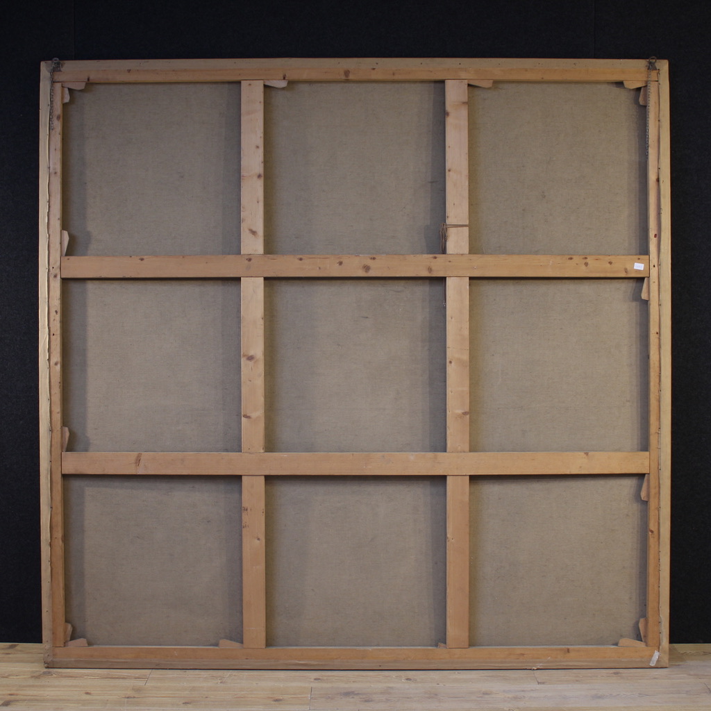 Perfect for lovers of classical mythology or for those seeking a dramatic work that won't go unnoticed. The painting has already been restored with re-lining, replacement of the stretcher, and restoration of small areas of color, and is in overall good condition. H 221 x W 228 x D 3 cm