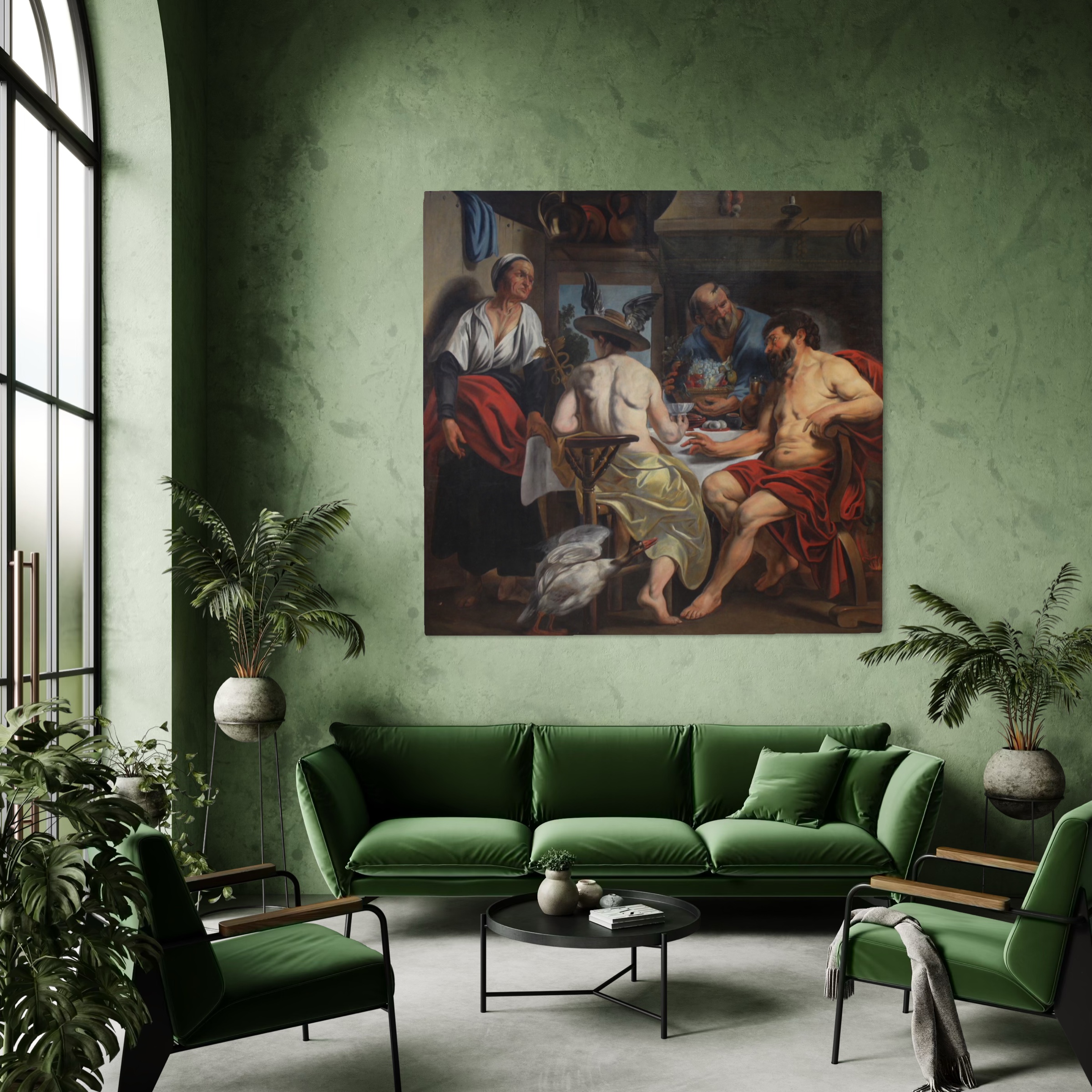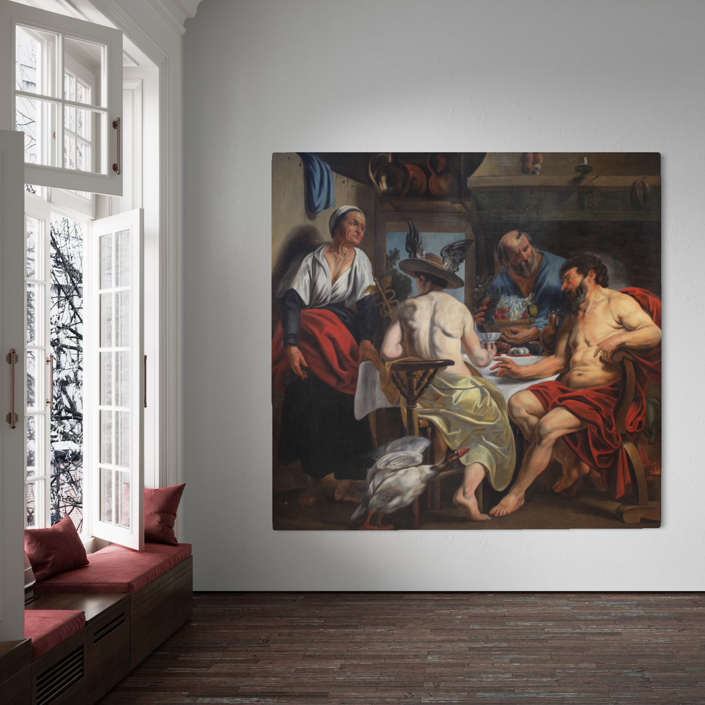 Großes flämisches Gemälde aus der Mitte des 18. Jahrhunderts. Öl auf Leinwand, das eine berühmte Episode aus Ovids Metamorphosen darstellt. Jupiter und Merkur, als Wanderer verkleidet, werden von allen Bewohnern einer Gegend abgewiesen, bis auf ein älteres Bauernpaar, Philemon und Baucis. Da geschieht ein Wunder: Der Wein geht nicht aus, und der Tisch scheint sich zu erneuern. Am Fuße des Tisches erscheint die Gans, das einzige Tier des Paares, das die Alten ihnen dennoch opfern wollen.