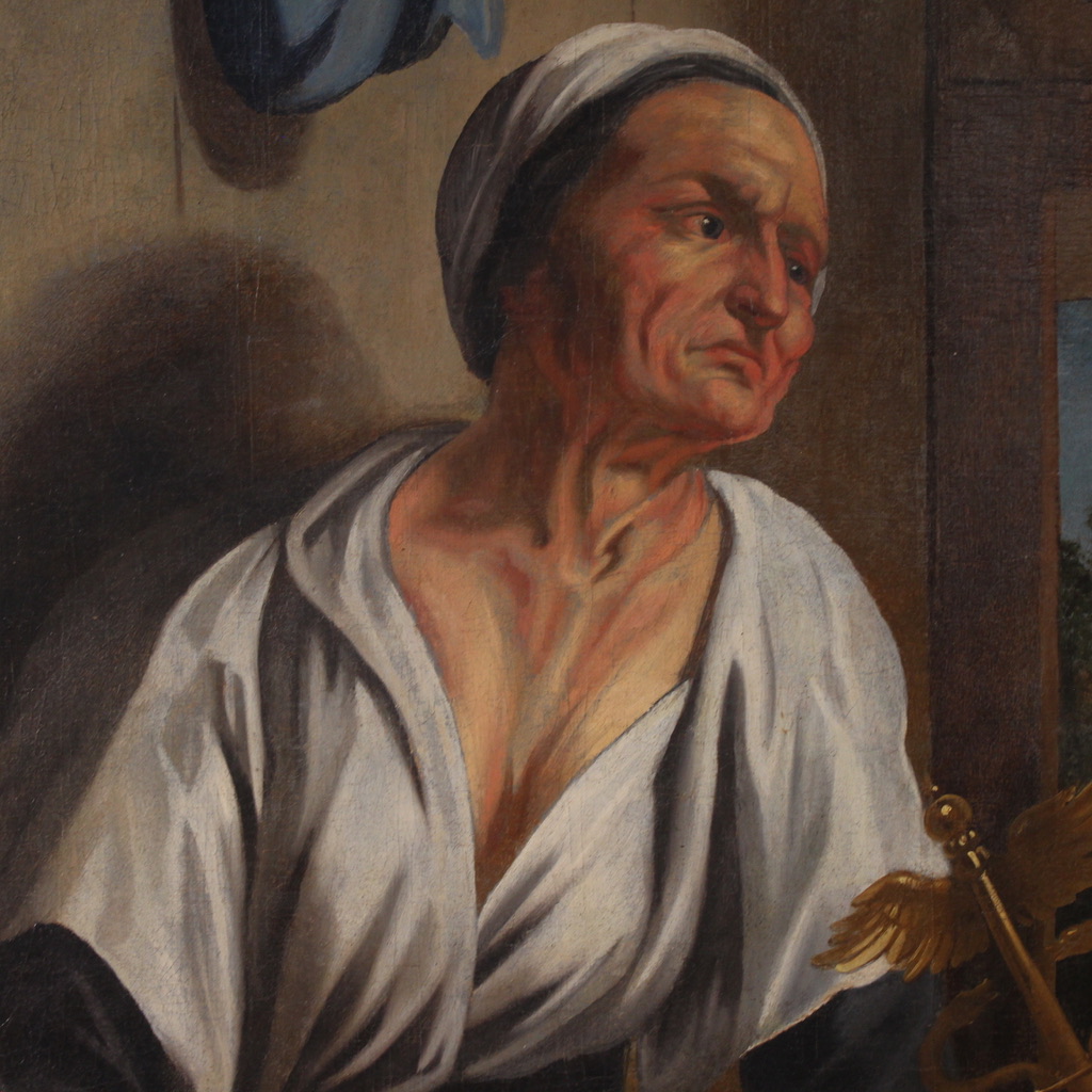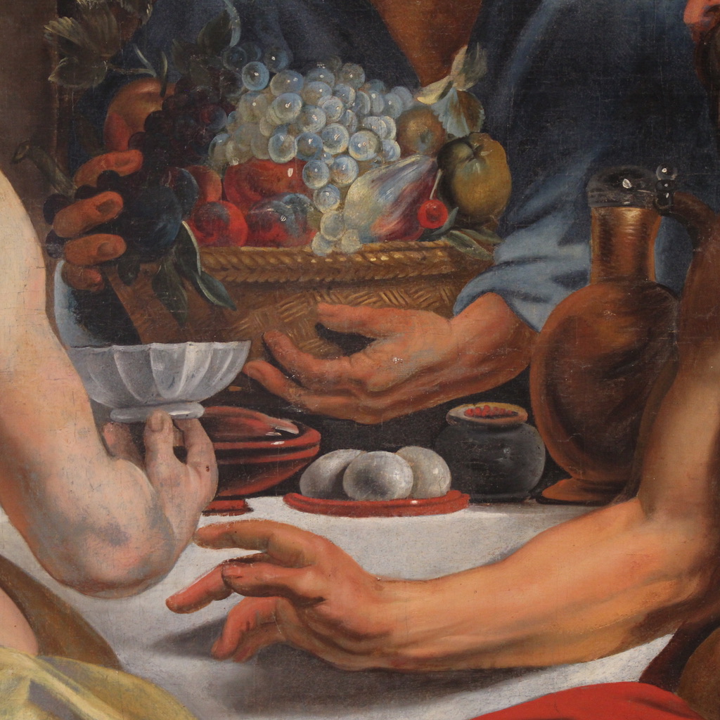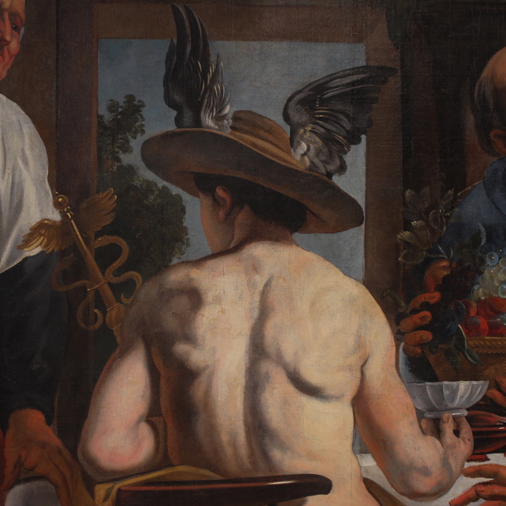 Great Flemish painting from the mid-18th century. Oil on canvas artwork depicting a famous episode from Ovid's Metamorphoses. Jupiter and Mercury, disguised as wayfarers, are rejected by all the inhabitants of a region except for an elderly peasant couple, Philemon and Baucis. At this point, a miracle occurs: the wine never runs out, and the table seems to be renewed. At the foot of the table appears the goose, the only animal the couple owns, which the elders nevertheless wish to offer.