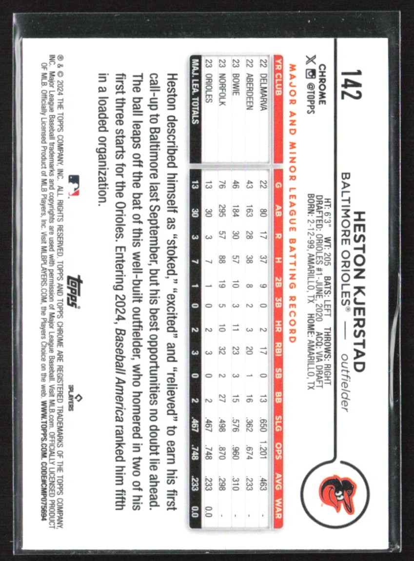 | Heston Kjerstad 2024 Topps Chrome Negative Refractor RC #142 Baltimore Orioles |