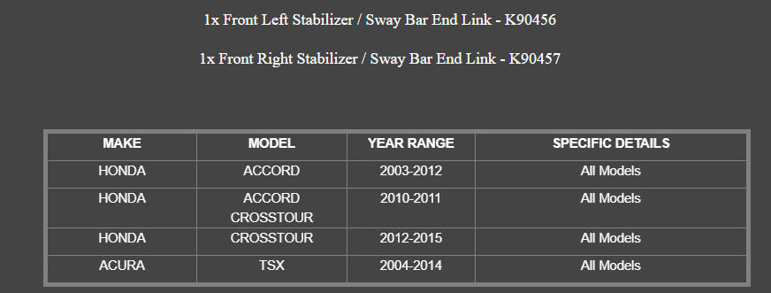 Fitment: MOOG number:K90456, K90457,or OE number:51321-SEA-E01, 51320-SEA-E01