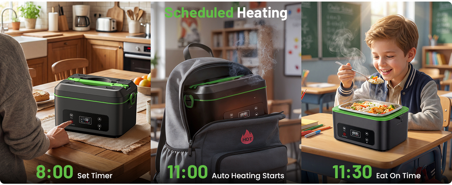 SCHEDULED HEATING TIMER: Set heating times in advance to enjoy hot food on busy days. This automatic self heating lunch box solves cold-lunch frustration for truck drivers, office workers and on-the-go commuters