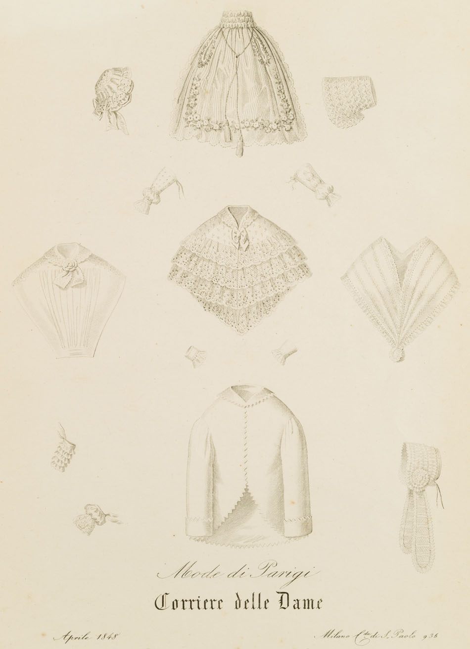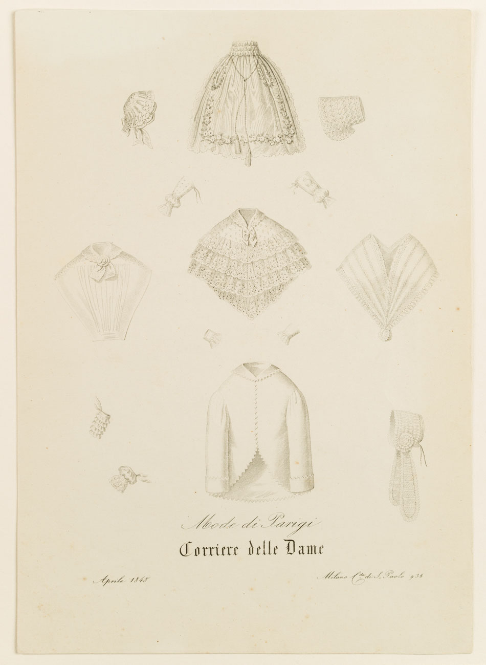 - Inscription: Unten betitelt: 'Mode di Parigi / Corriere della Dame / Aprile 1848 / Milano (...)'.