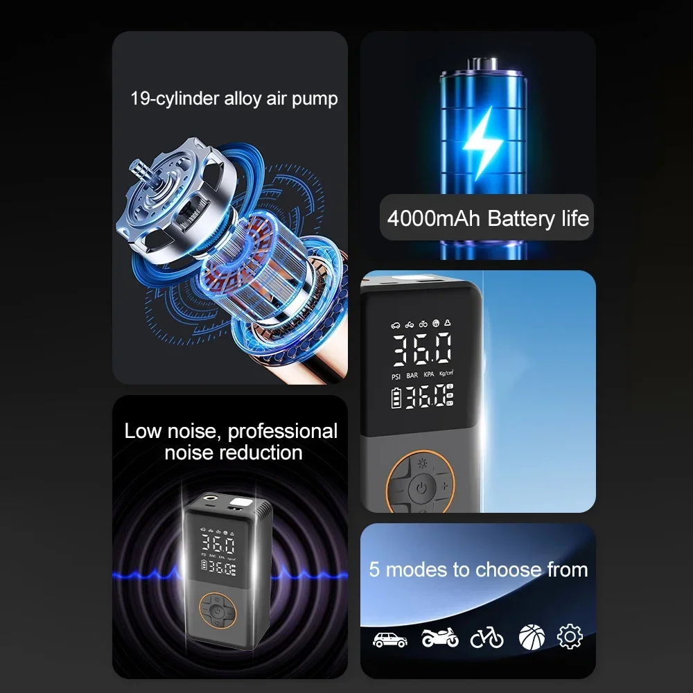 5. Large Capacity and Compact Design: With a built-in 4000mAh battery, the electric tire pump offers stable power and extended runtime, accompanied by a charger for convenient and fast recharging. Its compact and handy design facilitates easy storage without taking up much space, making it suitable for a wide range of applications including cars, motorcycles, bicycles, electric scooters, wheelchairs, basketballs, footballs, and more. This feature-packed, aesthetically pleasing product is your go-to for all inflation needs.