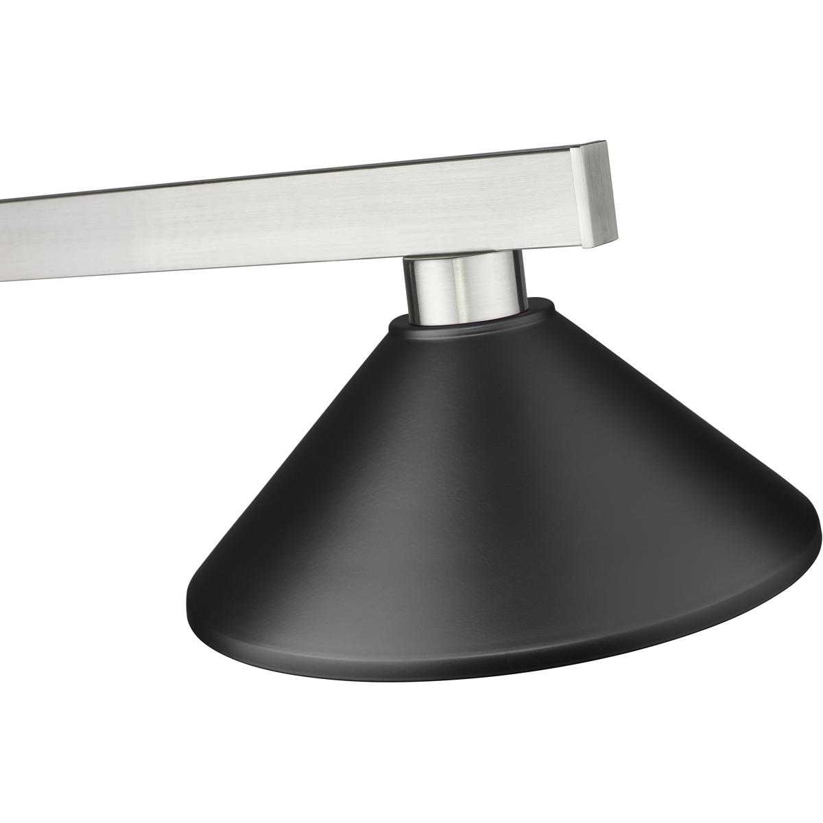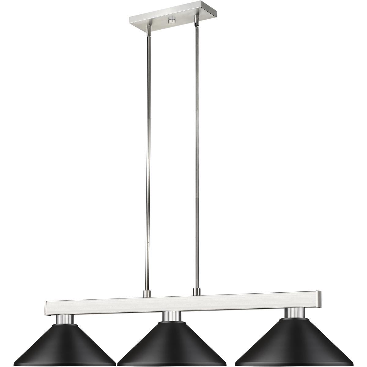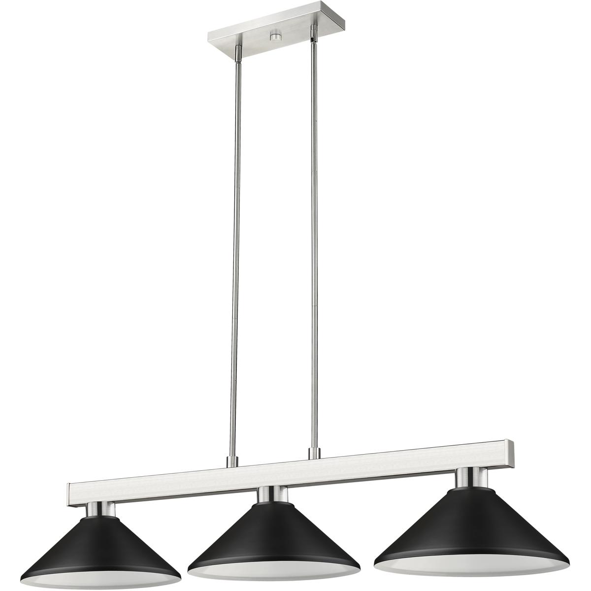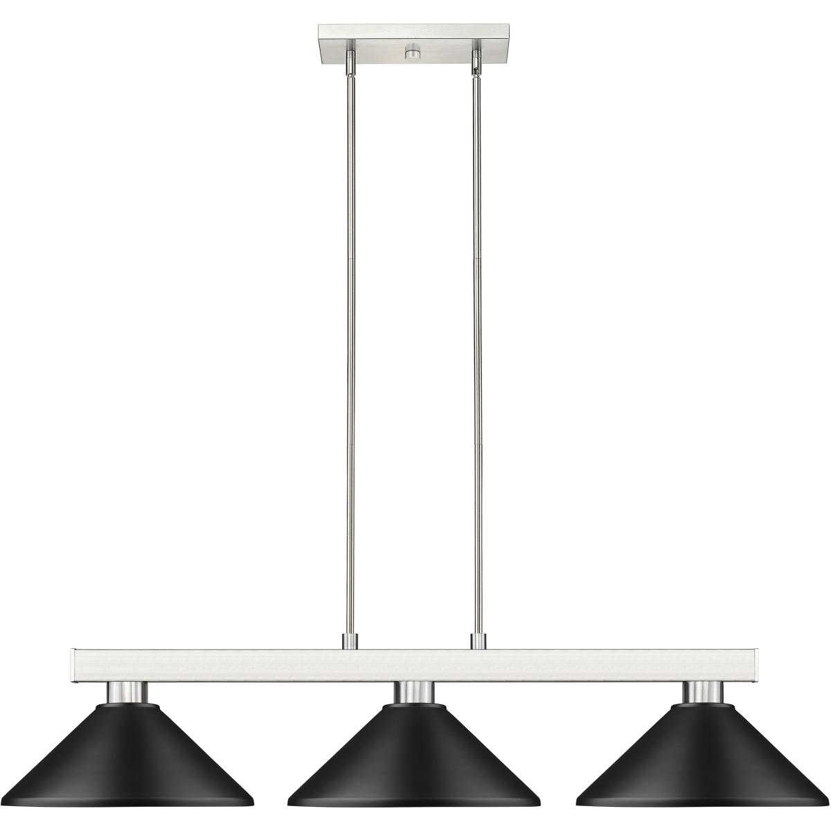 Straight line inspired detailing defines this beautiful three light fixture. Finished in brushed nickel and paired with metal satin gold shades, this three light fixture would be equally at home in the game room, or anywhere else in the house needing a touch of modern charm. Adjustable rods are included to ensure the perfect hanging height.