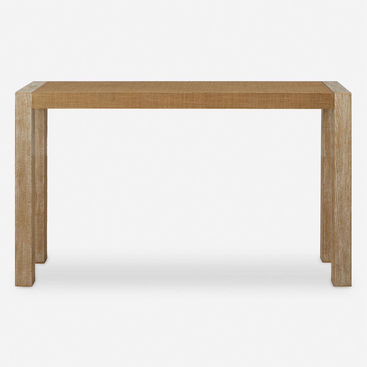 Mid Century Inspired With Accents Of Natural Rattan Cane, This Console Table Features Mindi Solids And Veneers Finished In A Soft Oak Stain. Has One Storage Shelf And Two Drawers With Metal Hardware In Dark Gunmetal.