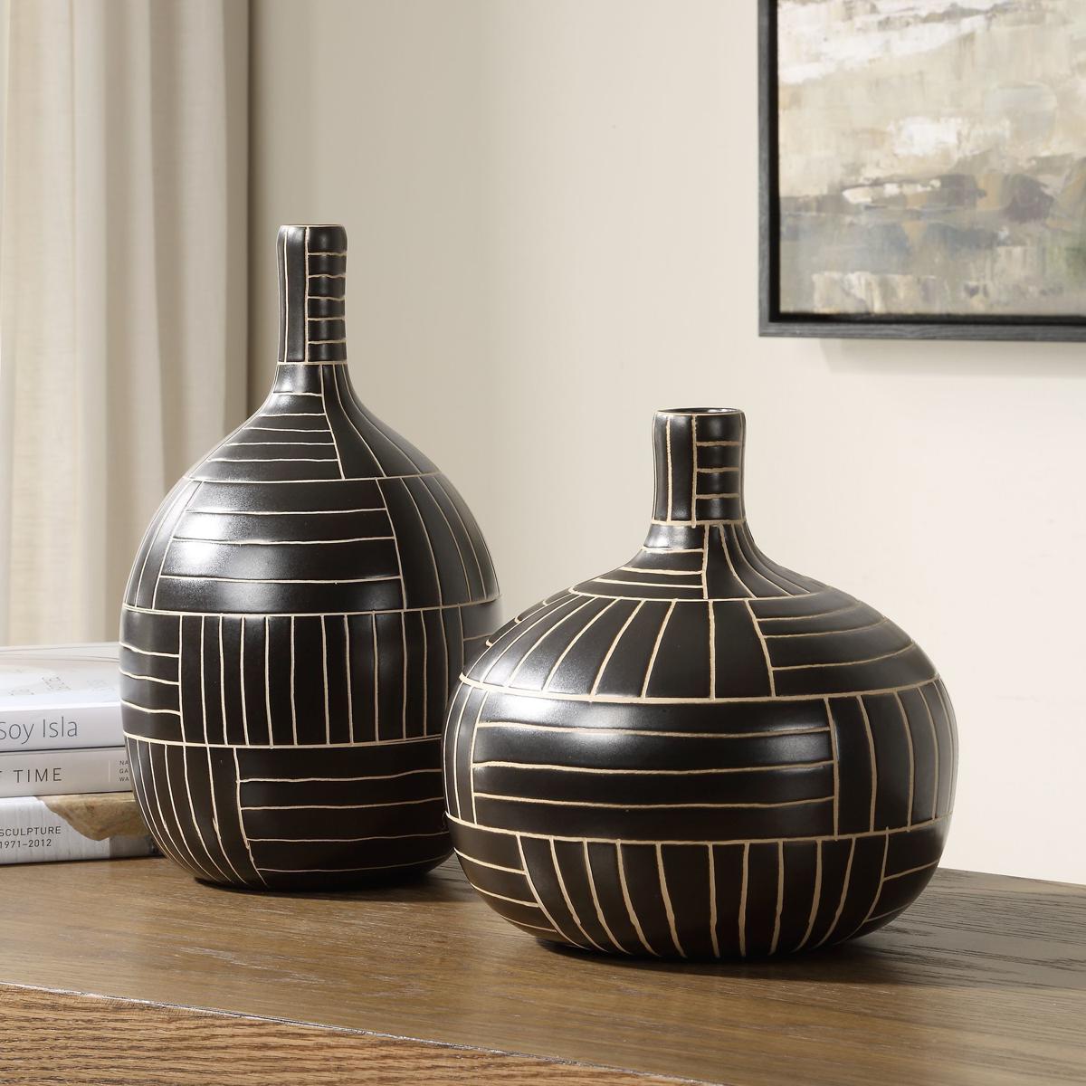 Elevate Your Home Decor With These Striking Black Ceramic Vases, Featuring A Sleek Geometric Design With Contrasting Ivory Lines. Perfect For Modern And Contemporary Spaces, These Handcrafted Statement Pieces Add Sophistication And Artistic Flair To Any Setting. Sizes: S-10x10x10, L-8x14x8