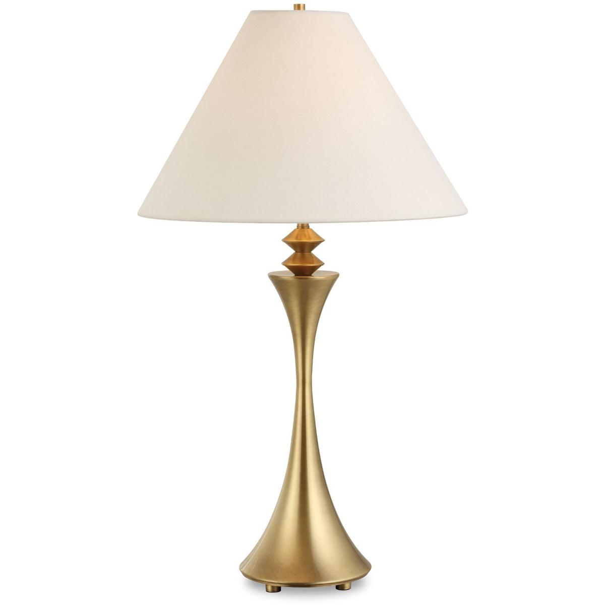 The Shaefer Table Lamp Showcases A Striking Flared Metal Base With Intricate Geometric Detailing In Plated Brass. The Coolie Style Shade Is Covered In A Crisp White Linen.