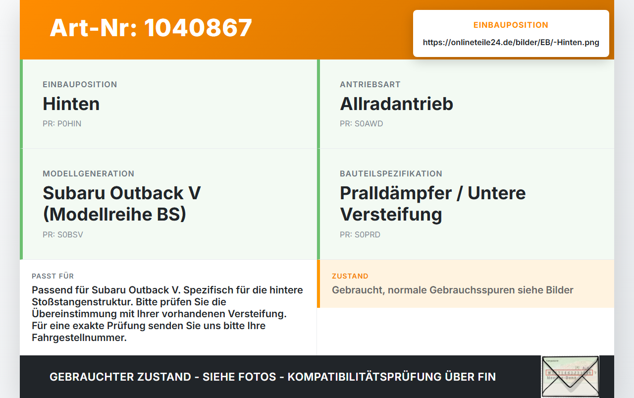 senden Sie uns Ihre Fahrgestellnummer zu, damit wir die Komapatibilität über Teilekatlaog prüfen können.