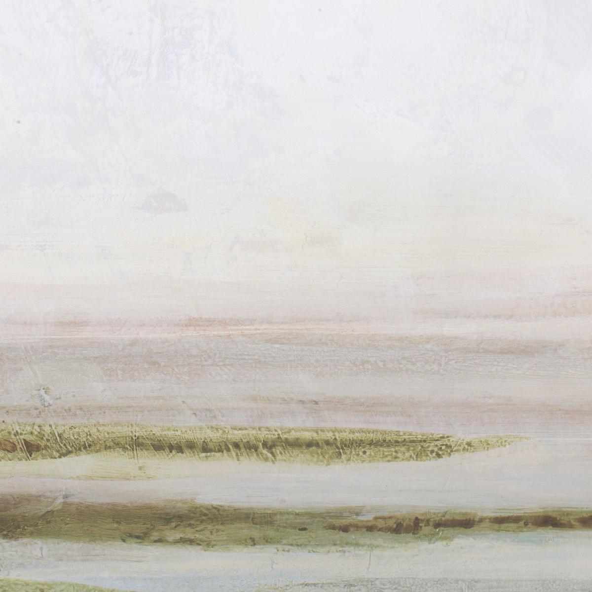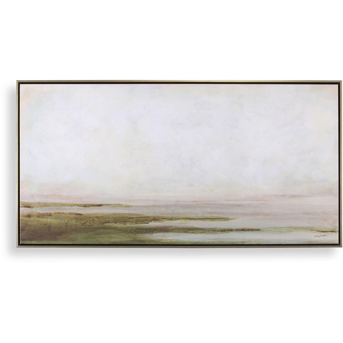 Hazy Lake's Low Horizon Line Divides The Canvas Into A Vast, Pale Sky Of Creamy Whites And Grays, Creating An Atmospheric Contrast With The Subtle Hints Of Muted Greens And Browns On The Textured Ground. The Artwork Is Surrounded By A Simple, Yet Classic Gallery Frame In A Gold Finish. Each Canvas Is Proudly Handcrafted And Printed In The USA. Artwork By Haley Knighten.