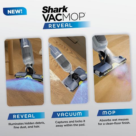 The Shark VACMOP Reveal is a versatile cordless hard floor vacuum and spray mop designed to deliver a comprehensive cleaning experience on all sealed hard floors such as hardwood, laminate, tile, stone, marble, and vinyl. Equipped with innovative Dirt-Reveal Technology, it highlights hidden dirt and debris so you never miss a spot. The device features powerful suction to vacuum dirt while the on-demand spray function releases a fast-drying, streak-free multi-surface cleaning solution at the touch of a button. Its lightweight design ensures easy maneuverability around furniture and tight spaces. The included disposable VACMOP pads securely lock in dirt and debris for hygienic disposal after use. This all-in-one cleaning system comes with 6 disposable pads and a 12oz bottle of cleaning solution to maintain spotless floors effortlessly.