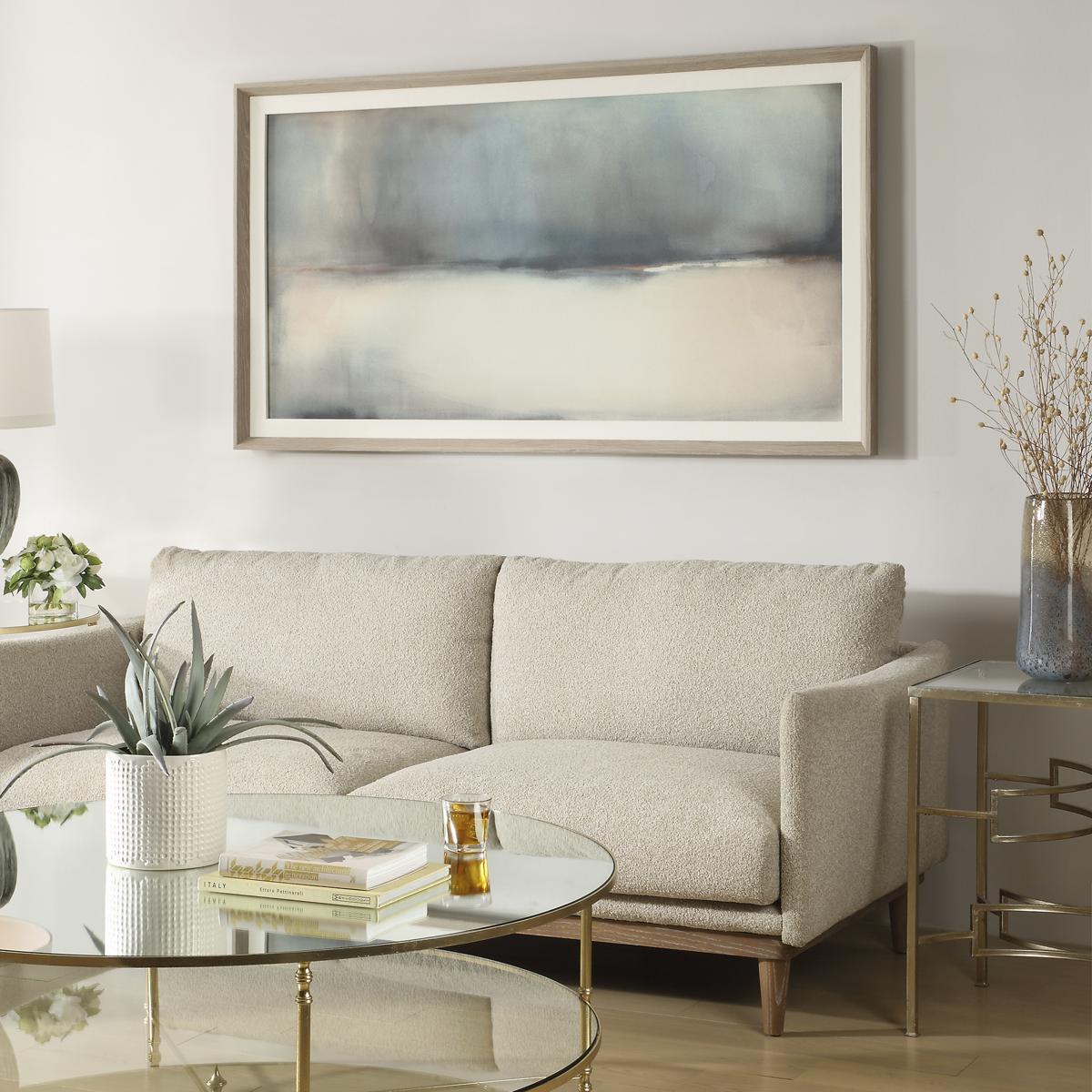 Creating A Stunning Interplay Of Light And Shadows, Deep Rains Draws Your Eye Across The Print With Its Tranquil Depth And Moody Palette Of Deep Teals And Beige Undertones. A Natural Light Pine Frame With An Oatmeal Linen Liner Accentuate This Piece. Artwork By Kippi Leonard.