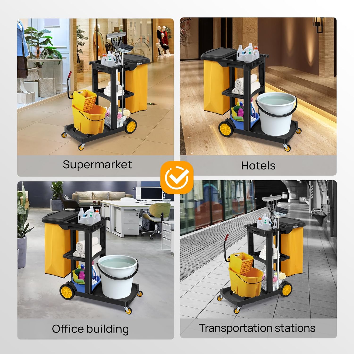 The 3-Shelf Janitorial Cart is made of Heavy Duty PP Material and Plastic Sprayed Iron Frame that Resists Cracking, Peeling, and Corrosion - Able to Hold Max 500 Lbs.