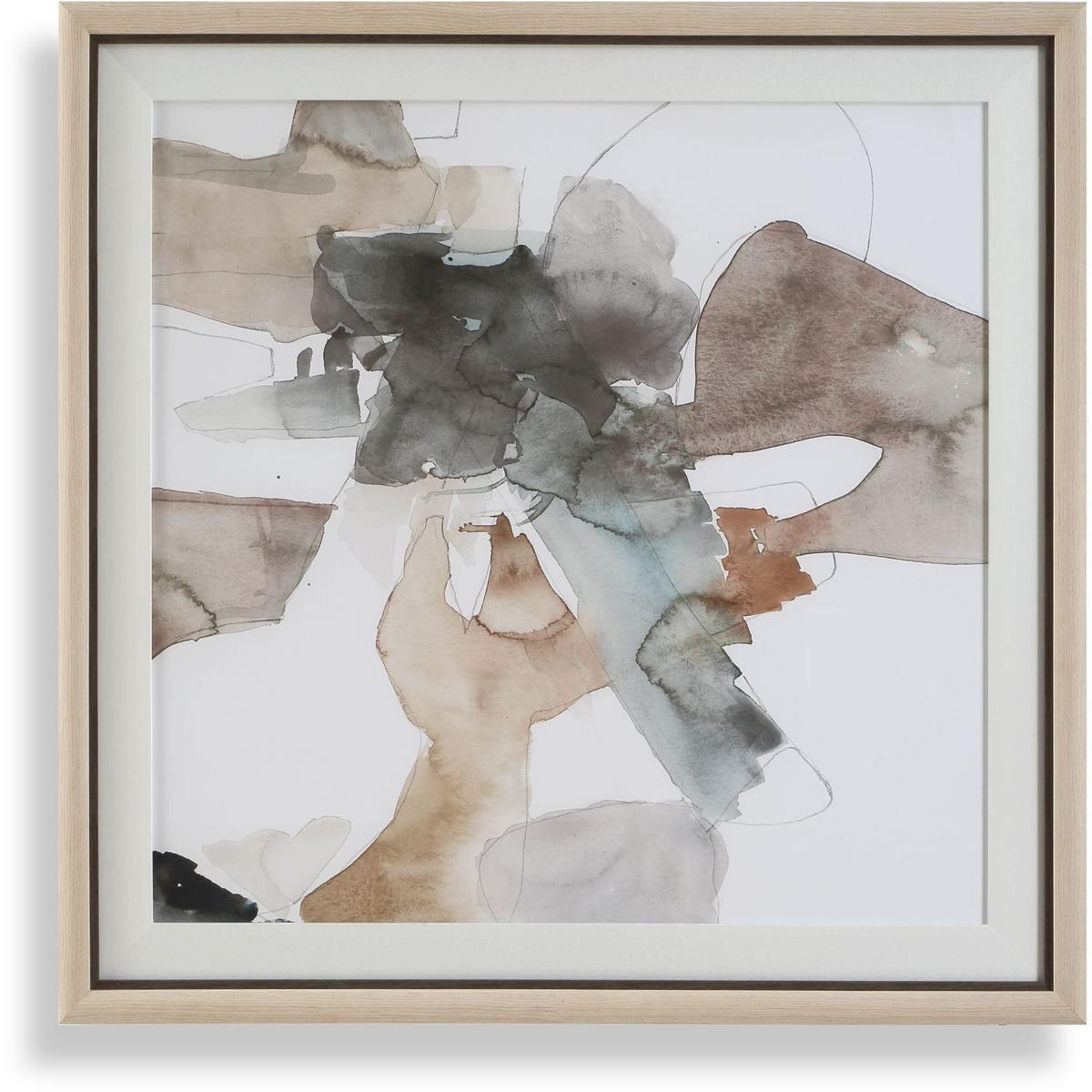 Cohesion Features An Intriguing Abstract Composition Rendered In Delicate, Watercolor-like Tones. Soft Washes Of Pale Brown, Subtle Hints Of Warm Orange, And Cool Undertones Of Blue Blend Harmoniously, Creating A Sense Of Calm Movement. Encased In A Light Pine Wood Frame With A Dark Washed Wooden Liner And Crisp White Paper Mat. This Piece Is Placed Under Protective Glass. This Piece May Be Hung Horizontal Or Vertical.
