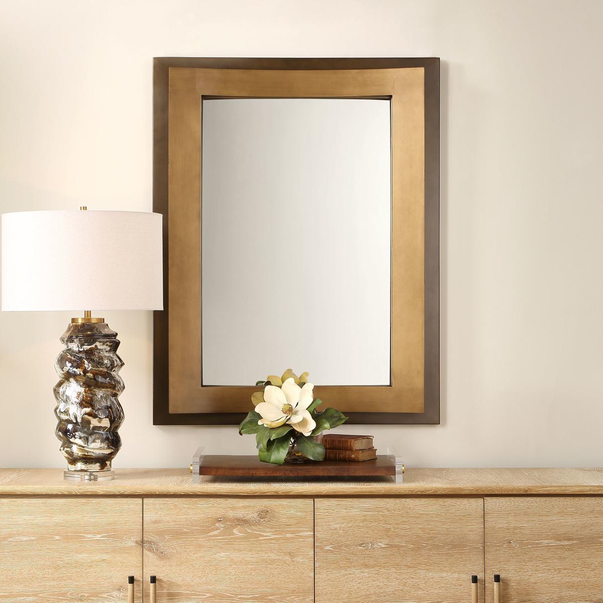 A Striking Golden Bronze Iron Frame With An Added 3-dimensional Touch Showcasing Gracefully Curved Details, Adding A Touch Of Fluidity To Its Classic Rectangular Form. May Be Hung Horizontal Or Vertical.