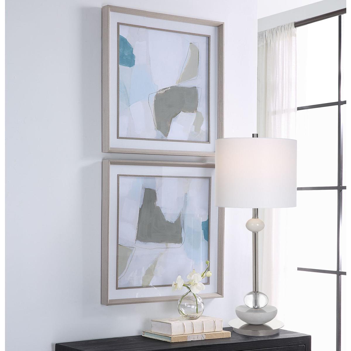 These Modern Works Of Art Add A Touch Of Style And Serenity To Your Space With Their Cool Blue And Gray Tones. Each Print Is Accented By A White Linen Mat And Light Gray Pine Frame And Fillet, Placed Under Protective Glass. Artwork By June Vess.