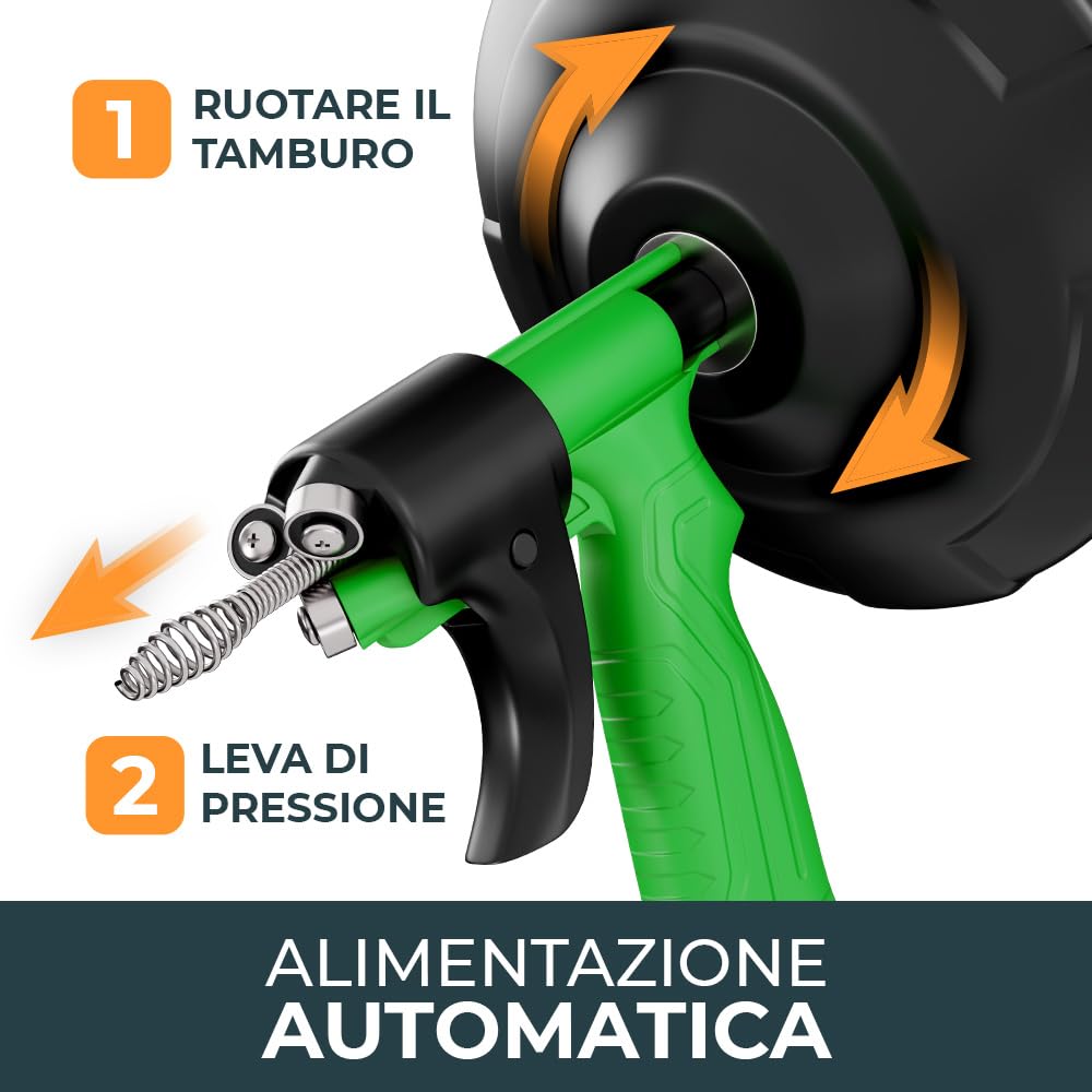 SGORGA I TUBI IN MENO DI 8 MINUTI - Con la nostra molla sturatubi professionale per scarichi otturati, lunga oltre 7,5 metri, potrai rimuovere le ostruzioni più profonde in meno di 8 minuti - risparmiandoti la parcella dell'idraulico!