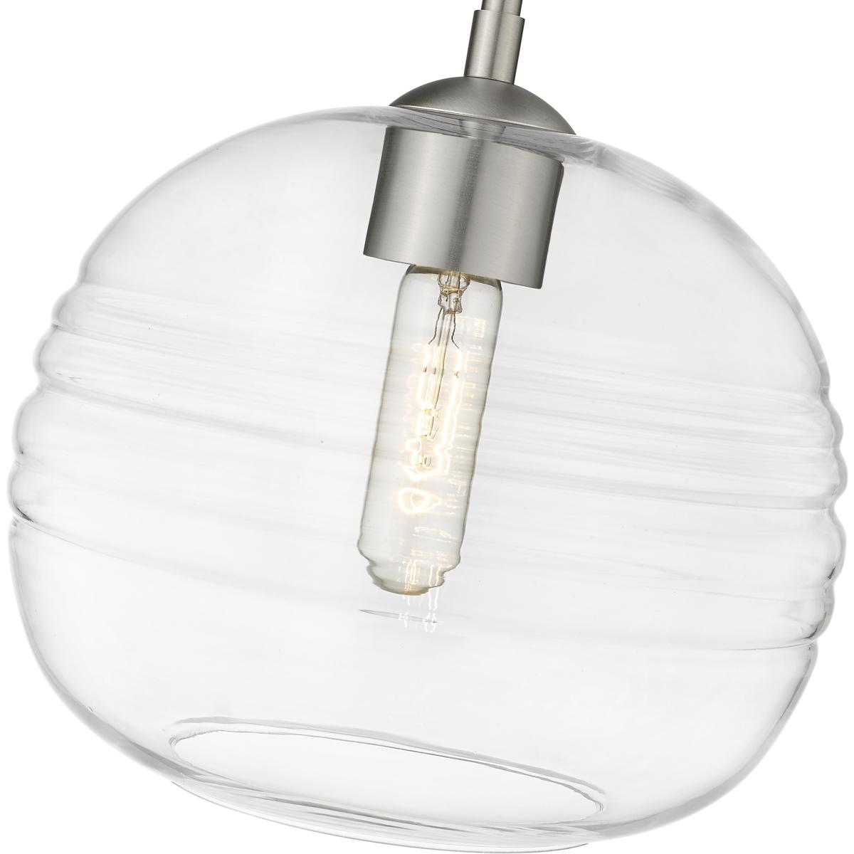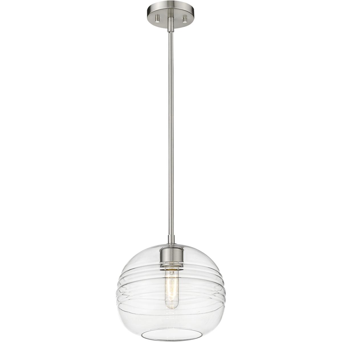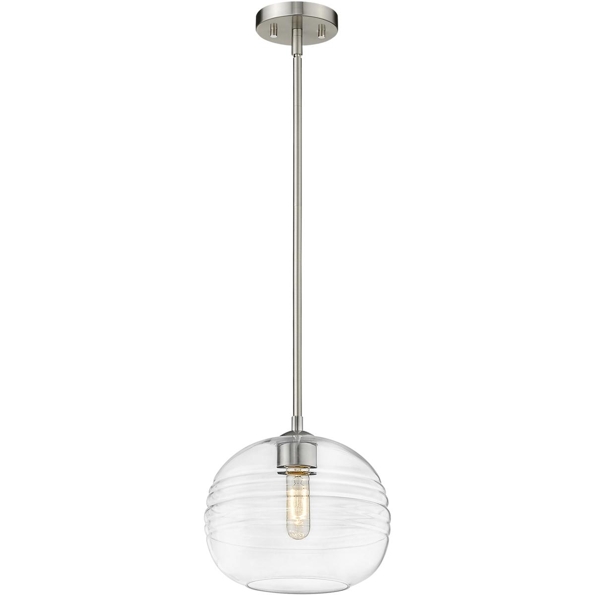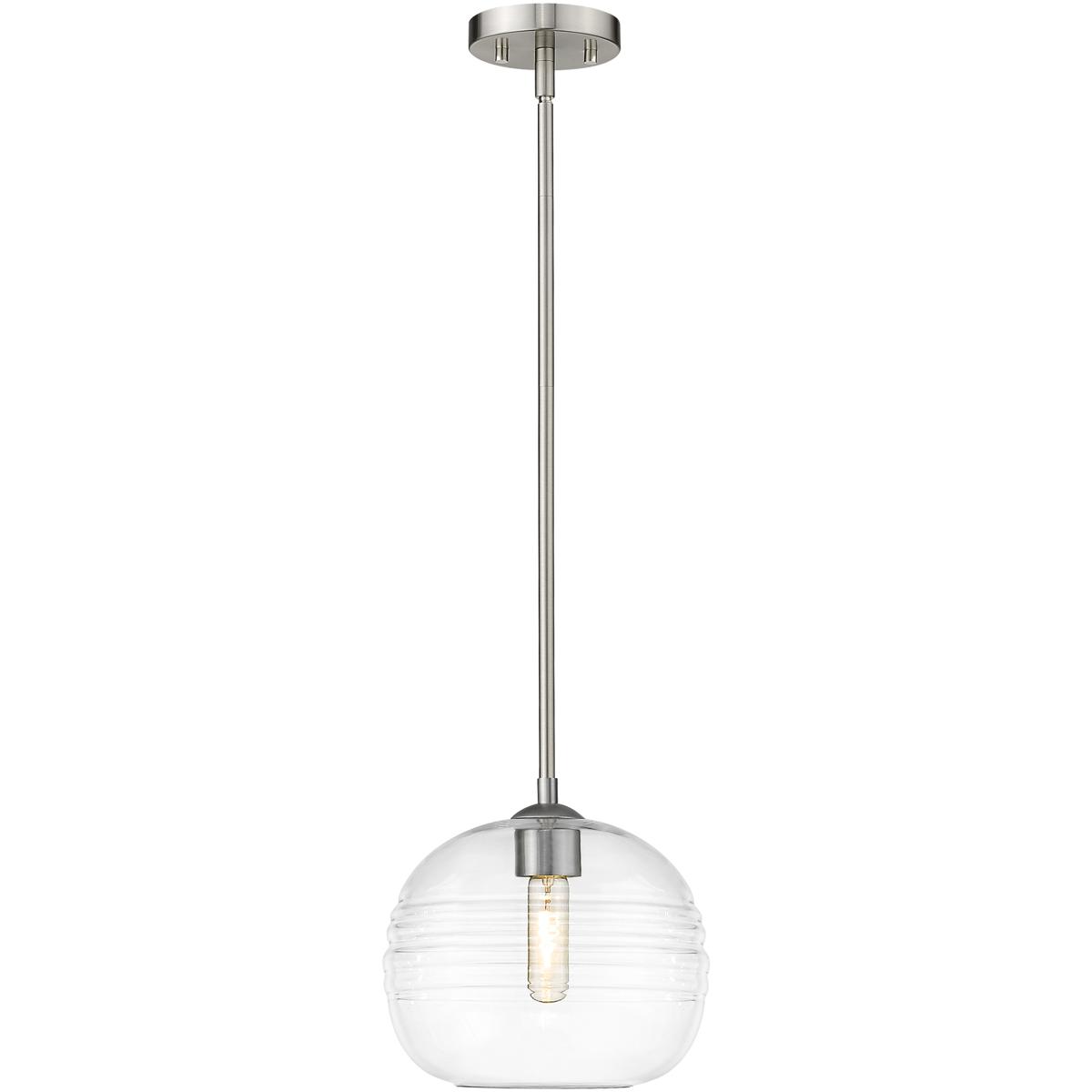 Express your modern aesthetic with this eye-catching one-light pendant. The grooved, rounded shade is made from clear glass, suspended from a sleek steel frame with a brushed nickel finish. The fixture brings a chic cutting edge to a contemporary kitchen or dining room.