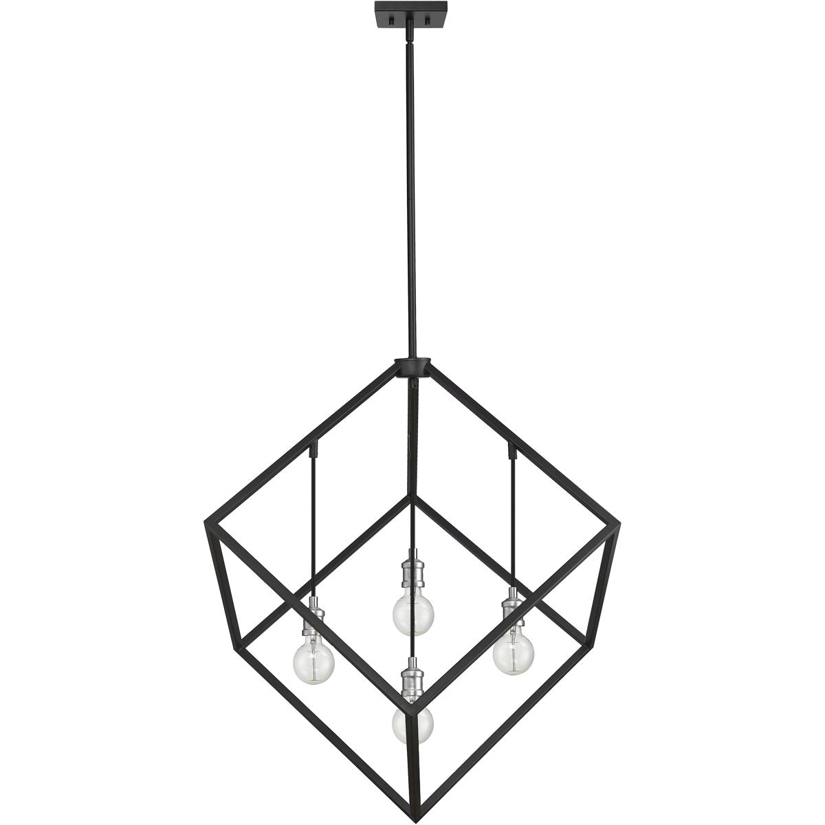 Enjoy the modern edge that this large two-tone four-light pendant adds to your home. It features a matte black and brushed nickel finish with the lights inside a single large cube-shaped shade for a dynamic look that energizes any space. It's a vibrant light designed to transform any dining room, hallway, bedroom, or kitchen.