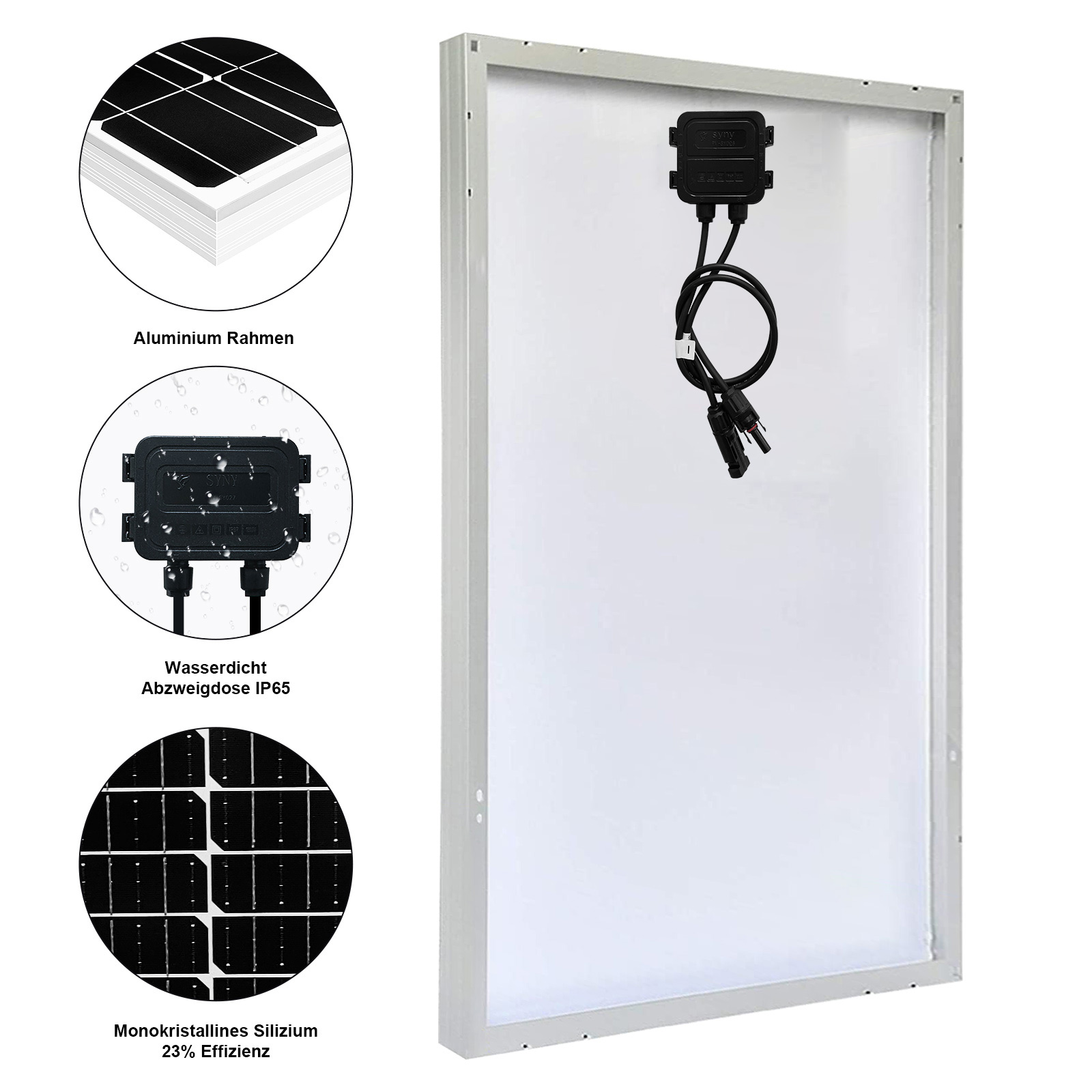 Solaranschlusskabeln und einer Anschlussdose geliefert. So können Sie es installieren, an einen Controller anschließen oder mit Panels erweitern, ohne ins Schwitzen zu geraten. Die Paneele bestehen aus erstklassigen monokristallinen Solarzellen der Klasse A+, die effizienter sind als herkömmliche polykristalline Solarzellen.