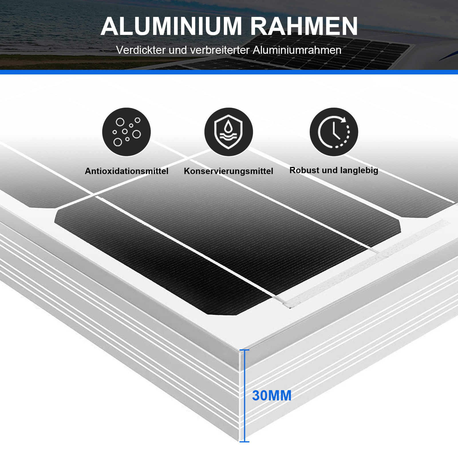 Ideal für Wohnmobile, Wohnmobile, Hütten, Meeresgebiete, Heimstromversorgung und mehr. Die Paneele verfügen über leichte Aluminiumrahmen und bruchsicheres Glas, wodurch sie sich perfekt für Außenanwendungen eignen.