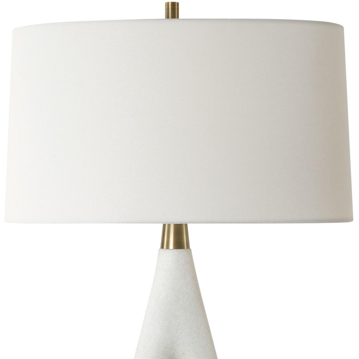 Crafted From Exquisite White Rice Stone, Its Unique Needle Eye Shape Offers A Modern Twist On Classic Forms. Gracefully Supported By A Plated Antique Brass Foot And Matching Hardware. This Lamp Is Not Just A Source Of Light, But A Piece Of Art. A Slightly Tapered Round Shade Made With A Crisp White Linen Fabric Completes The Piece.