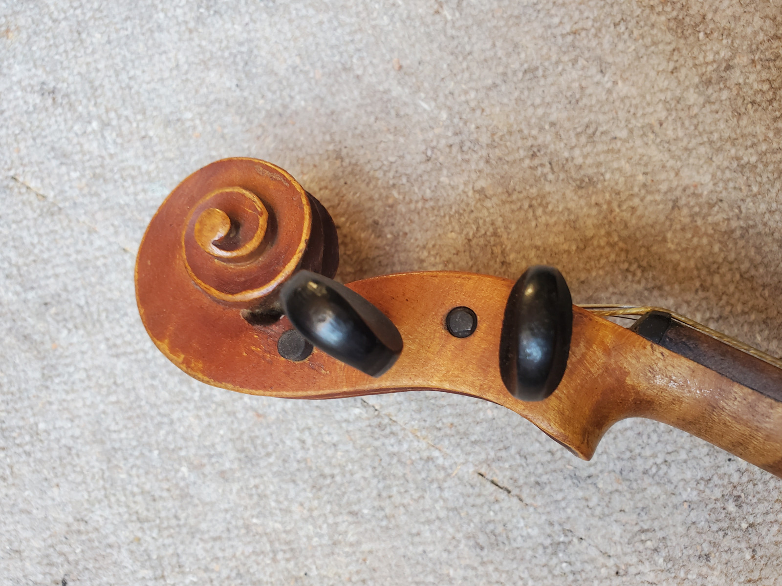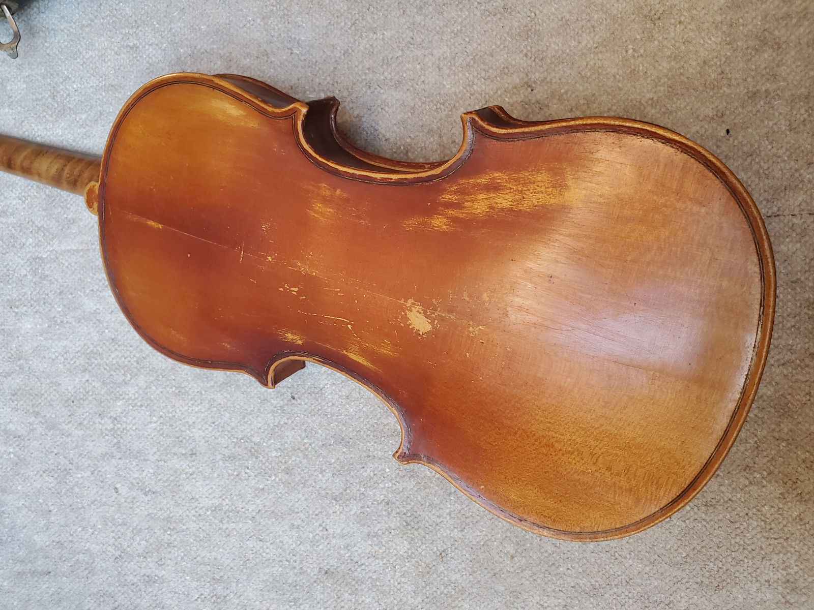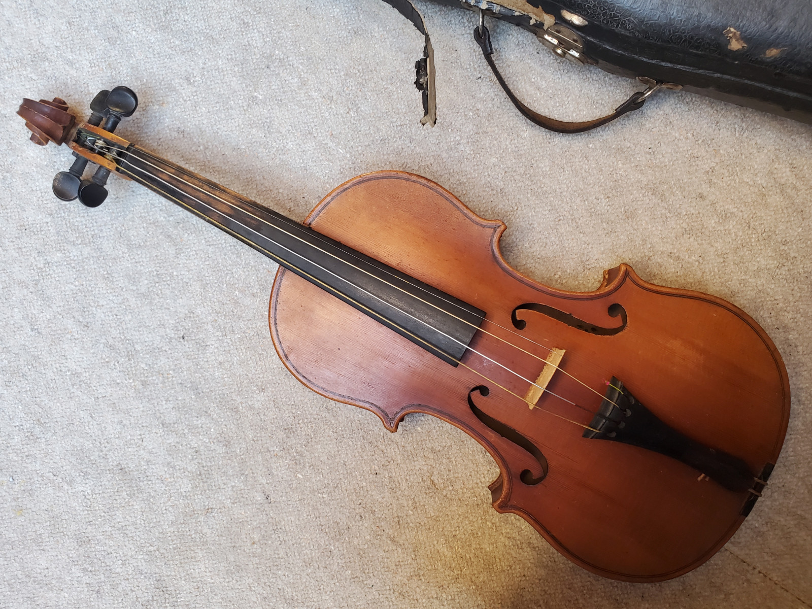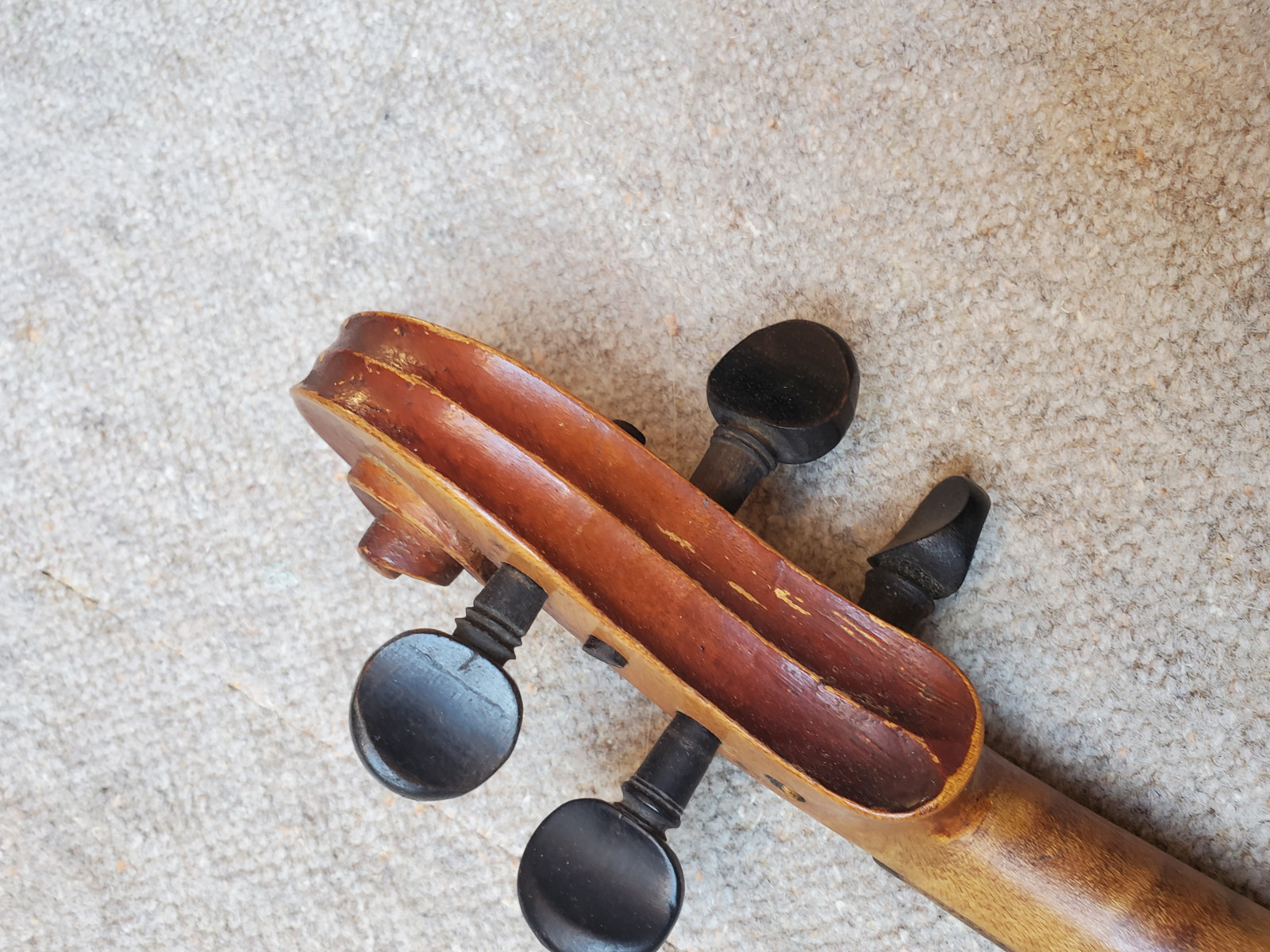 Nice old 4/4 (or 7/8?) violin No makersname to be found. The soundpost is ratteling inside. I found no cracks, but the front and the back of the violin are partly a bit loose. The length is 59cm/ 23 1/4 inch. The body is 35,6cm (14 inch). Instrument needs cleaning and service. If you have any questions, please ask. Insured shipping to USA or Canada amounts to 59 USD. Please also view my other auctions with instruments. Shipping several violins saves shippingfees. Please see my other auctions with string-, woodwind- and brass instruments ---------------------------------------------------------------------------------------------------------------------------------