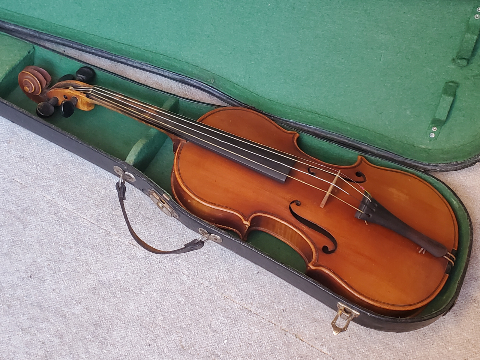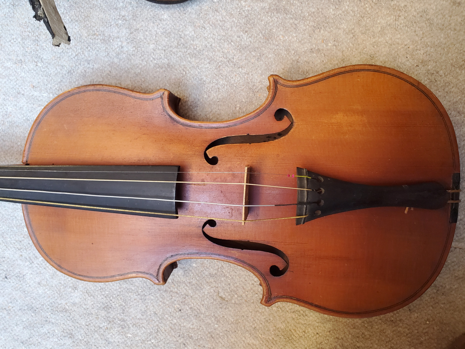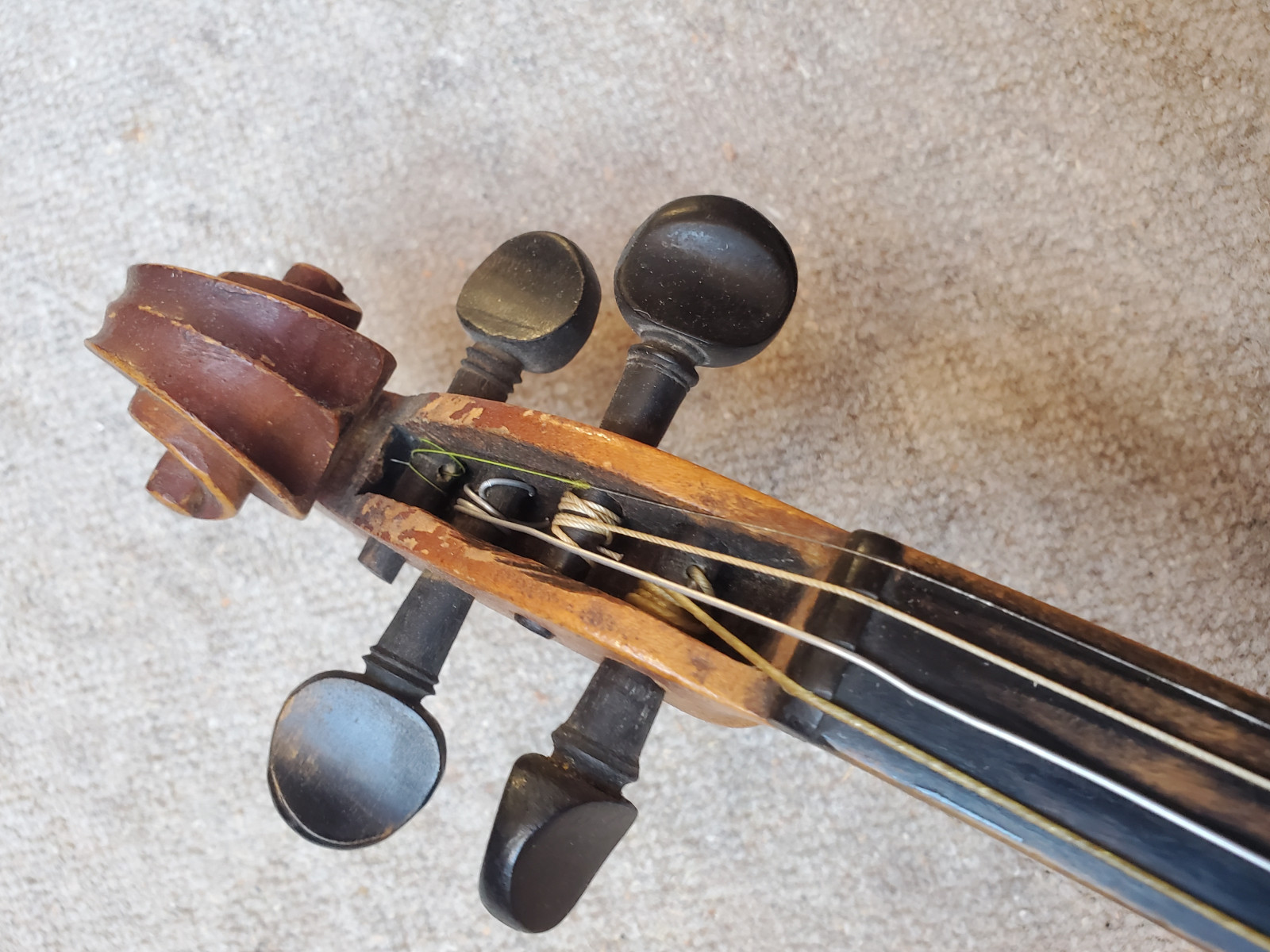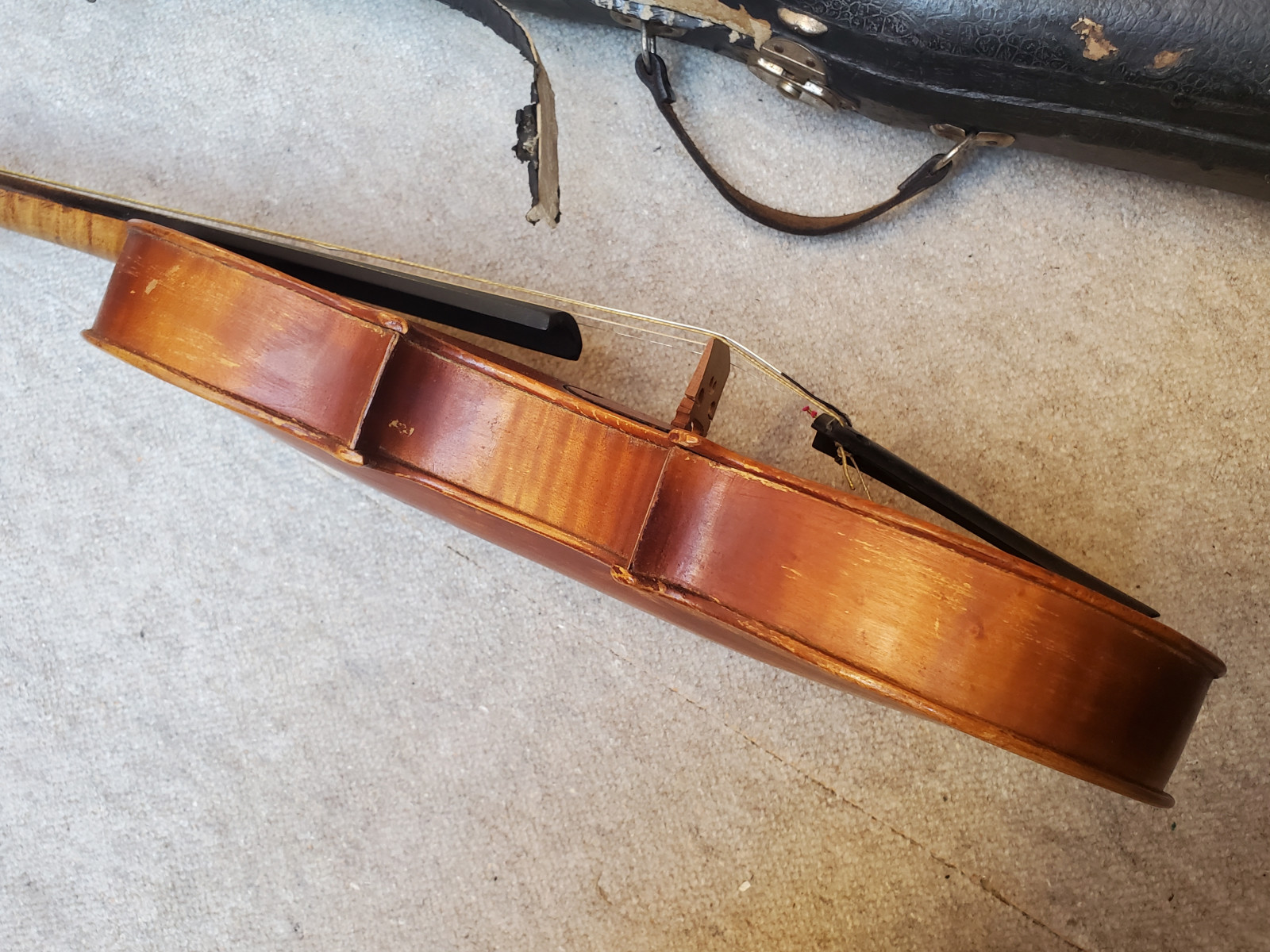 Nice old 4/4 (or 7/8?) violin No makersname to be found. The soundpost is ratteling inside. I found no cracks, but the front and the back of the violin are partly a bit loose. The length is 59cm/ 23 1/4 inch. The body is 35,6cm (14 inch). Instrument needs cleaning and service. If you have any questions, please ask. Insured shipping to USA or Canada amounts to 59 USD. Please also view my other auctions with instruments. Shipping several violins saves shippingfees. Please see my other auctions with string-, woodwind- and brass instruments ---------------------------------------------------------------------------------------------------------------------------------