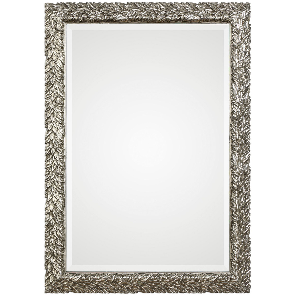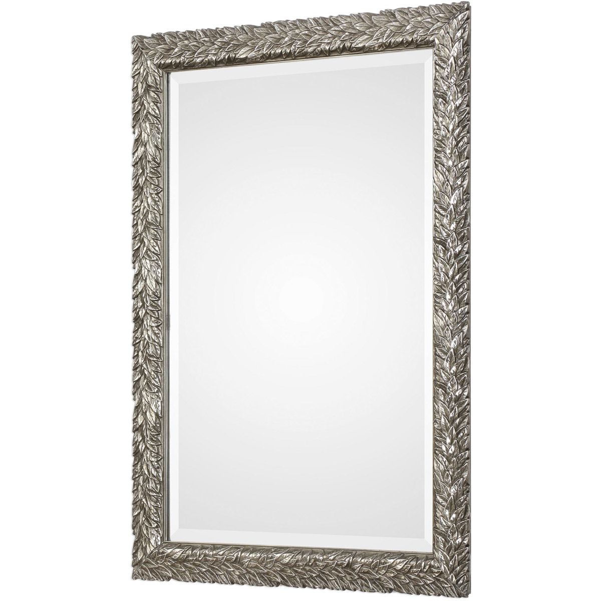 This Flowing Leaf Design Features A Delicate, 3-dimensional Texture, Finished In A Lightly Burnished Metallic Silver. Mirror Is Beveled. May Be Hung Horizontal Or Vertical.