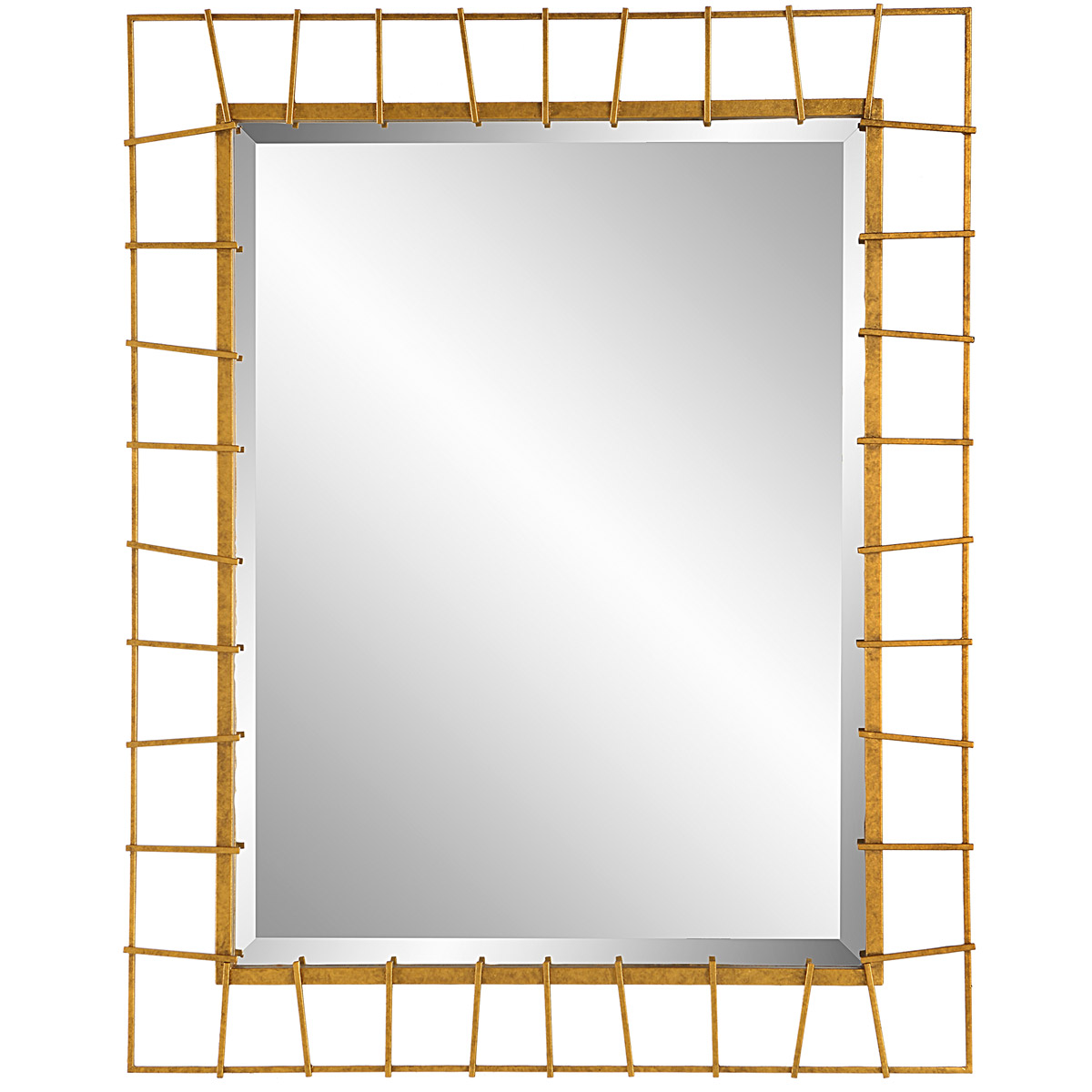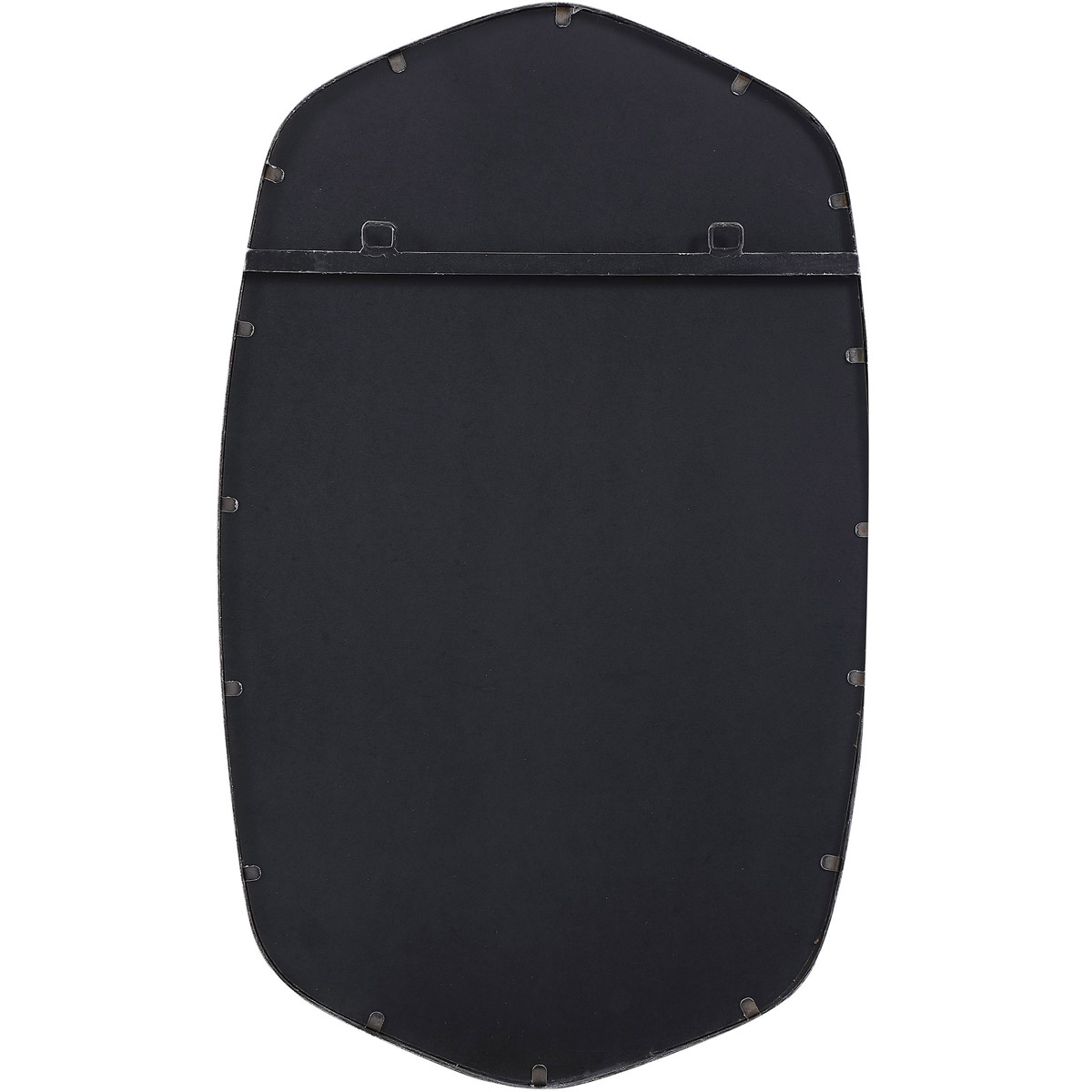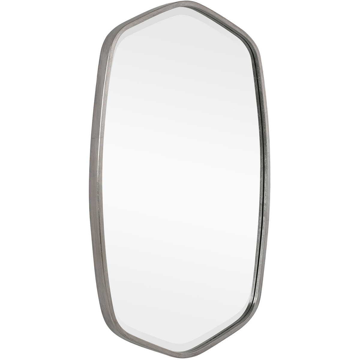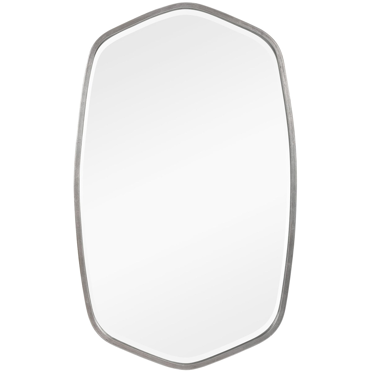 This Hand Forged Iron Mirror Frame Features A Unique Shape With Elegant Curves, Finished In A Versatile Brushed Silver. Mirror Has A Generous 1 1/4" Bevel.