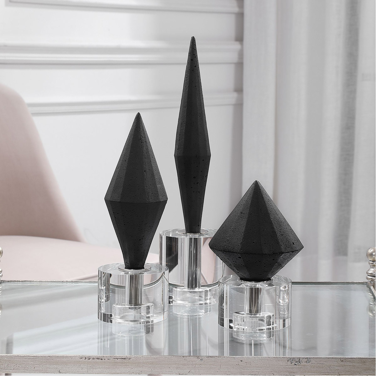 Elegant Black Diamonds Made Of Granulated Marble That Accurately Replicates The Look Of Thassos Marble Atop Crystal Bases. Sizes: S-5x7x5, M-4x10x4, L-4x14x4