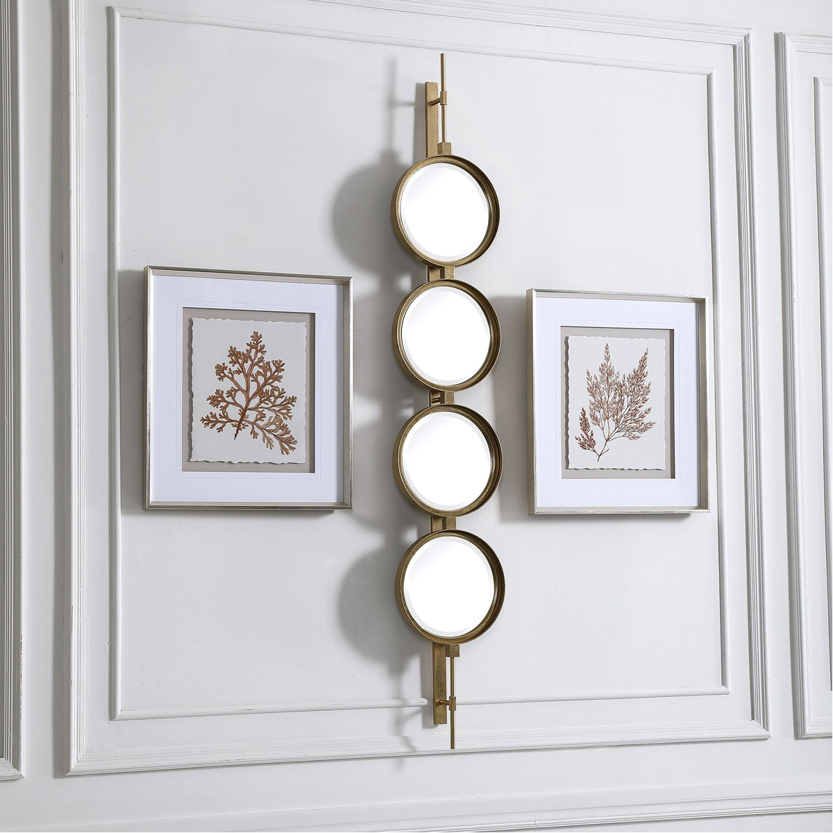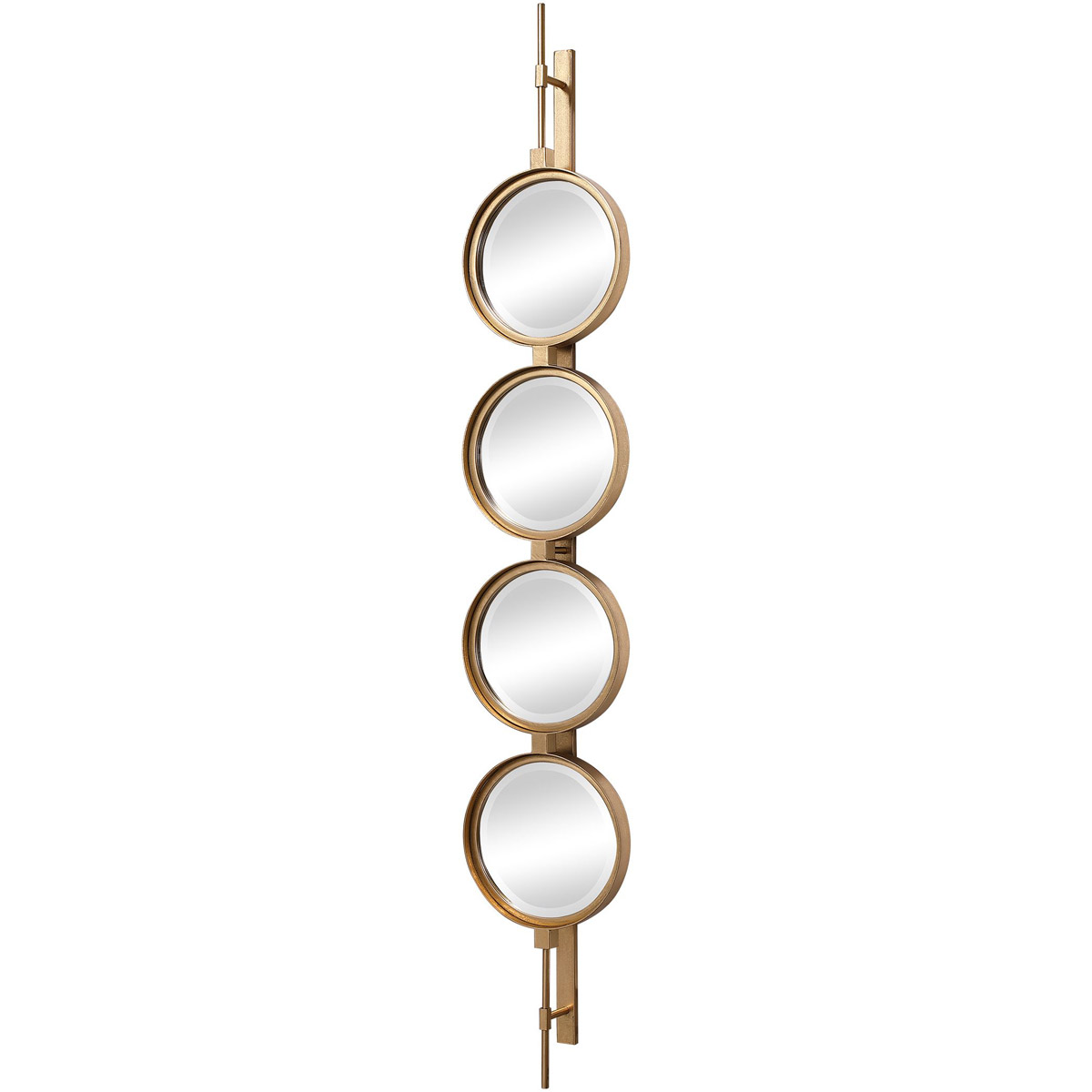 Contemporary In Style, This Mirror Features A Sleek Iron Base With Linear Metal Accents. The Piece Is Finished In Gold Leaf With Four Round Beveled Mirrors. Group Multiple Pieces Together And Hang Horizontal Or Vertical To Create A Truly Unique Wall Feature.