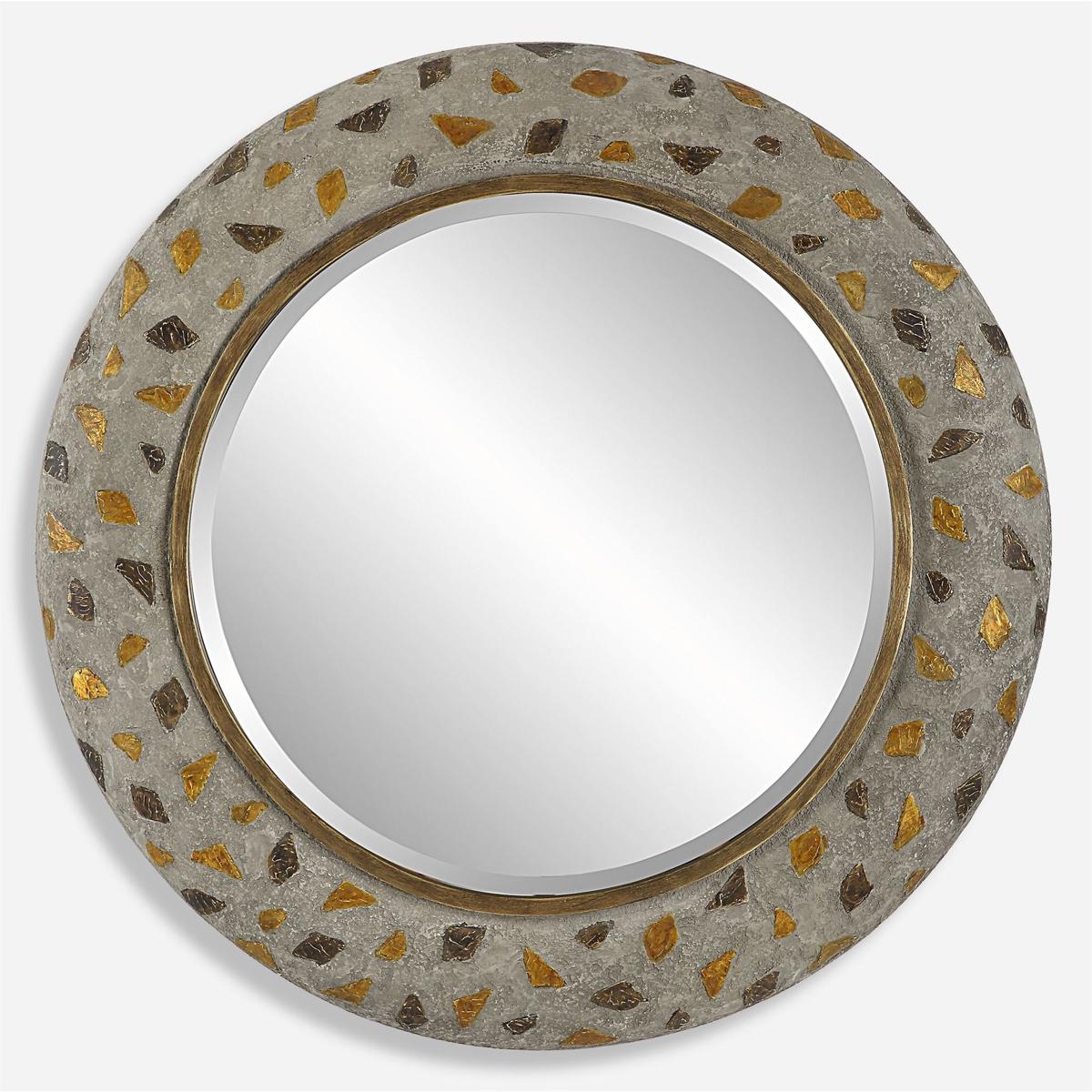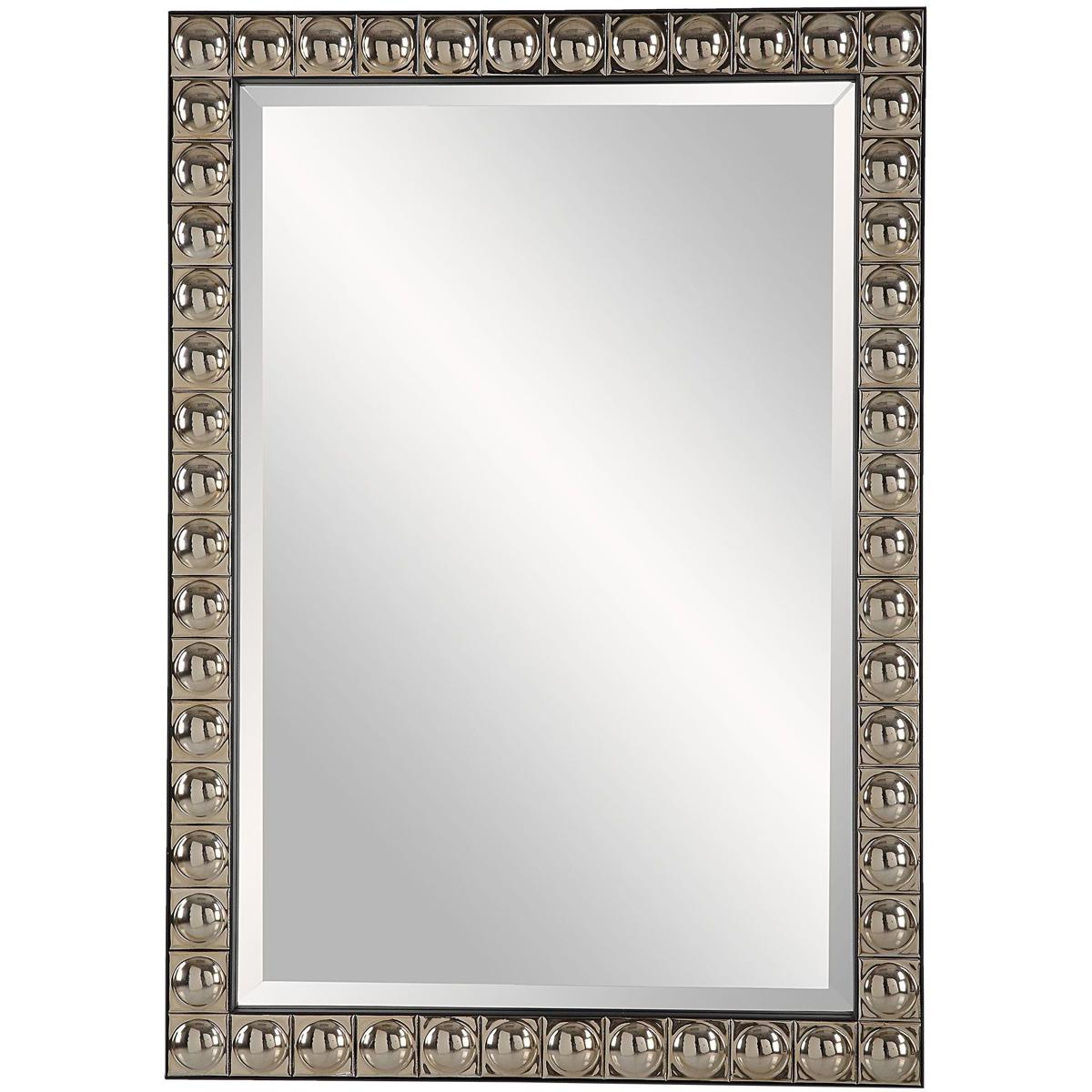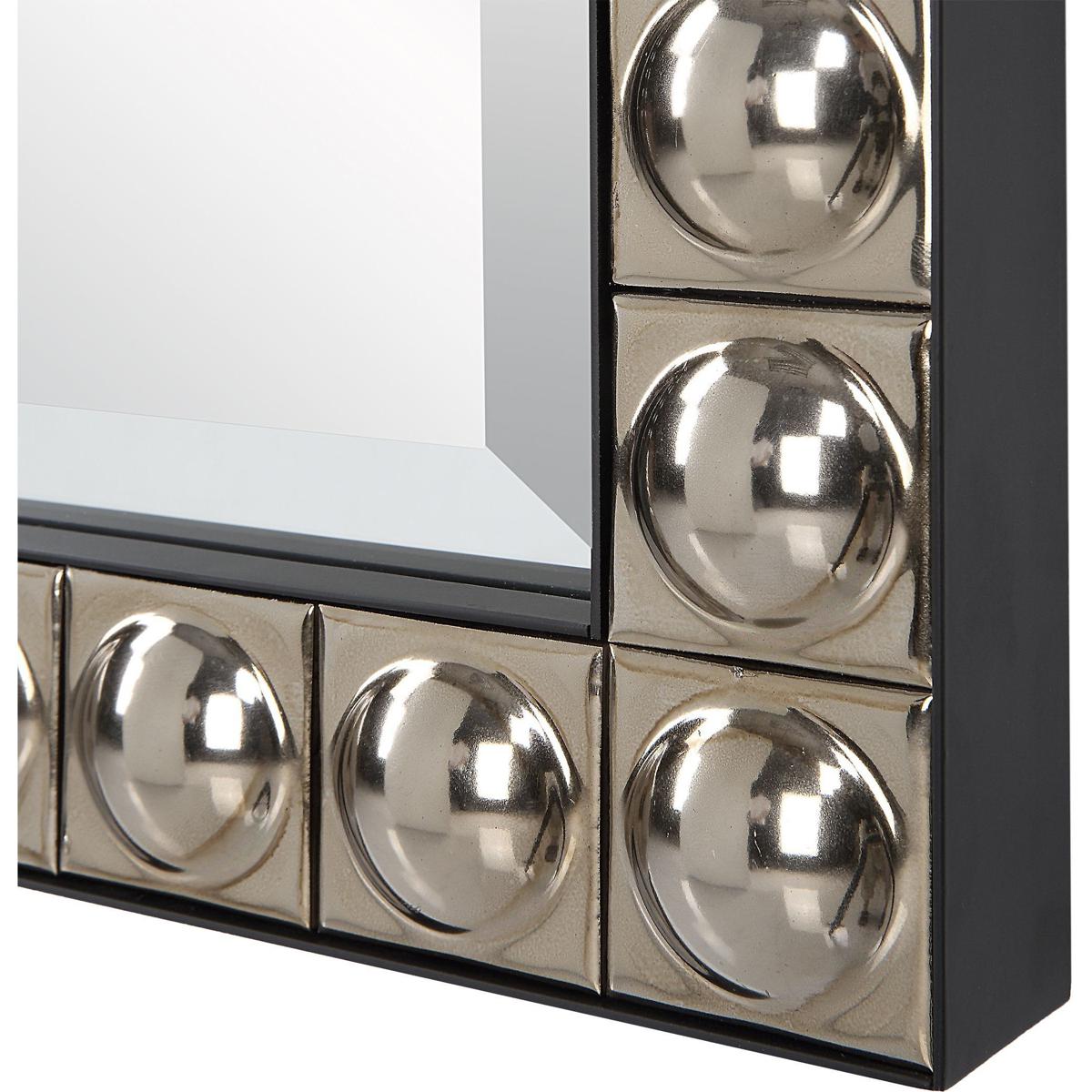 This Unique Vanity Mirror Features Repeated Ceramic Tiles With Convexed Centers Finished In An Antiqued Silver-champagne Plating, Encased In A Black Iron Inner And Outer Frame. Mirror Has A Generous 1 1/4" Bevel.