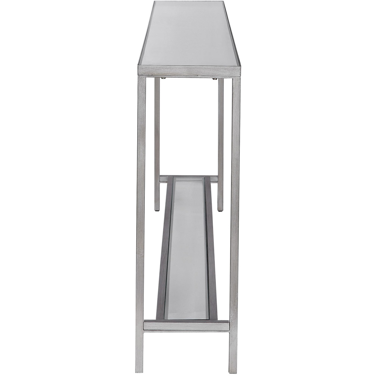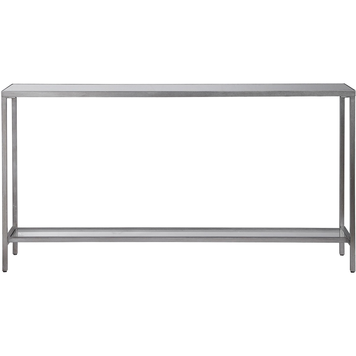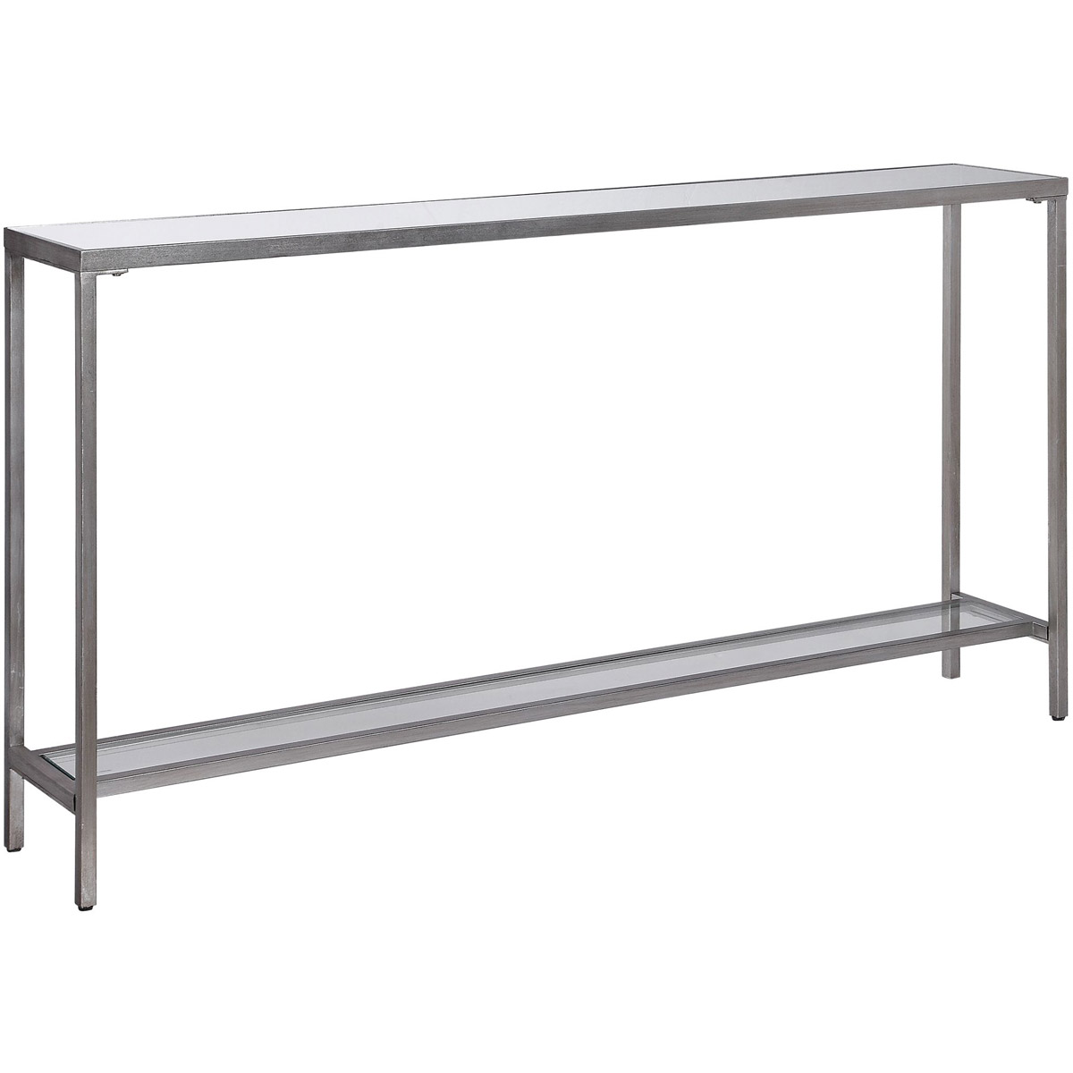 Classic And Minimalistic, This Narrow Iron Console Table Is Finished With Lightly Antiqued Silver Leaf, Inset With A Mirrored Top, And Gallery Shelf In Clear Glass.