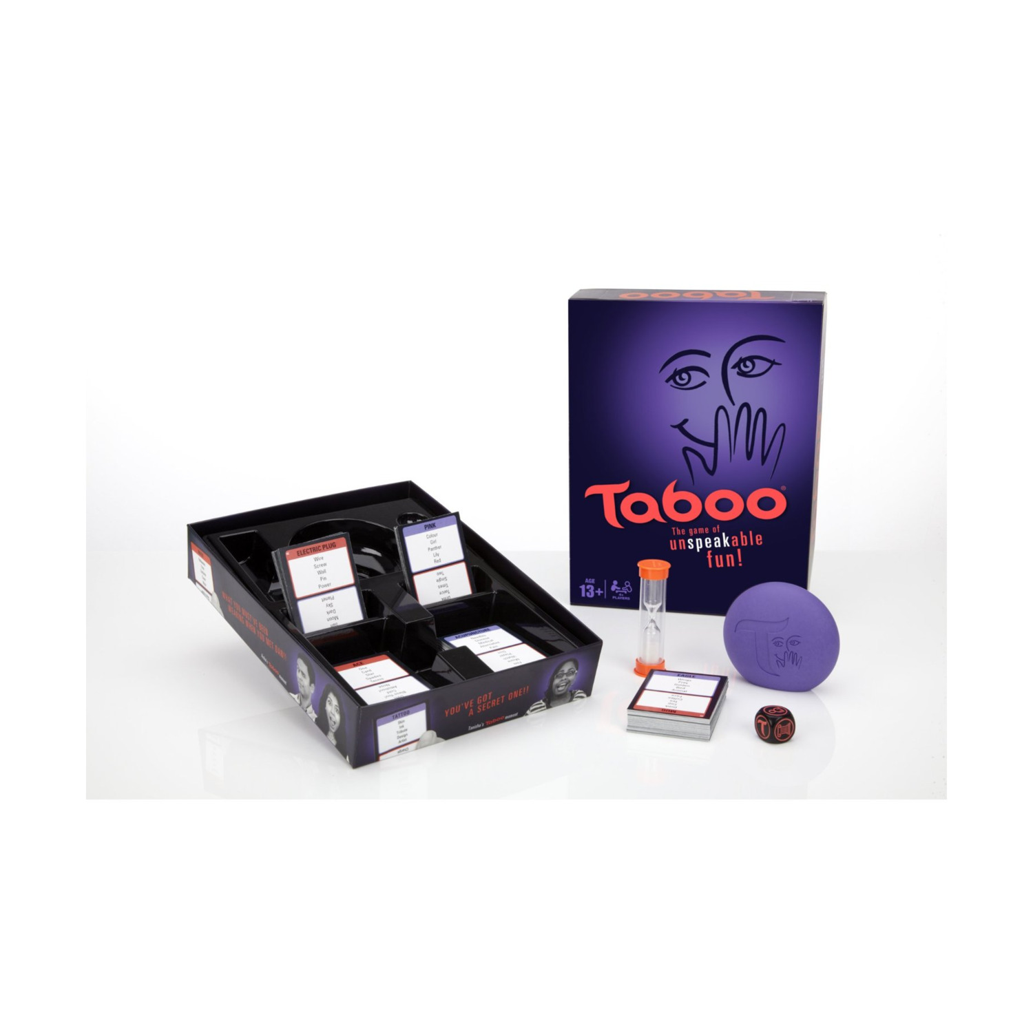 Taboo is the game of unspeakable fun. Can you get your team to say Brain Freeze? What if you can't say Ice Cream, Headache, Eating, Cold or Fast? Not so easy now, is it? When you play Taboo, the obvious clues are strictly taboo. You have to give creative, carefully-worded clues to get your team to guess words fast. But don't mention unmentionables, or you'll get the buzzer and lose the point. Once you've mastered the classic game, you can use the game-changer die to mix it up. If it lands on One Guesser, only one teammate can guess on your turn. With 4 other possibilities on the die, you'd better be shrewd, quick-thinking and willing to take some risks - but don't get shut down by the buzzer.