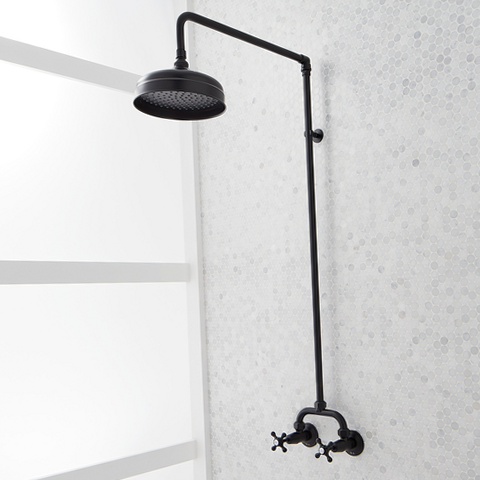 Wash away the stress of your daily routine with the Baudette Wall-Mount Shower with a rainfall showerhead. Featuring classic cross handles and an exposed pipe, this timeless shower unit is made of solid brass.