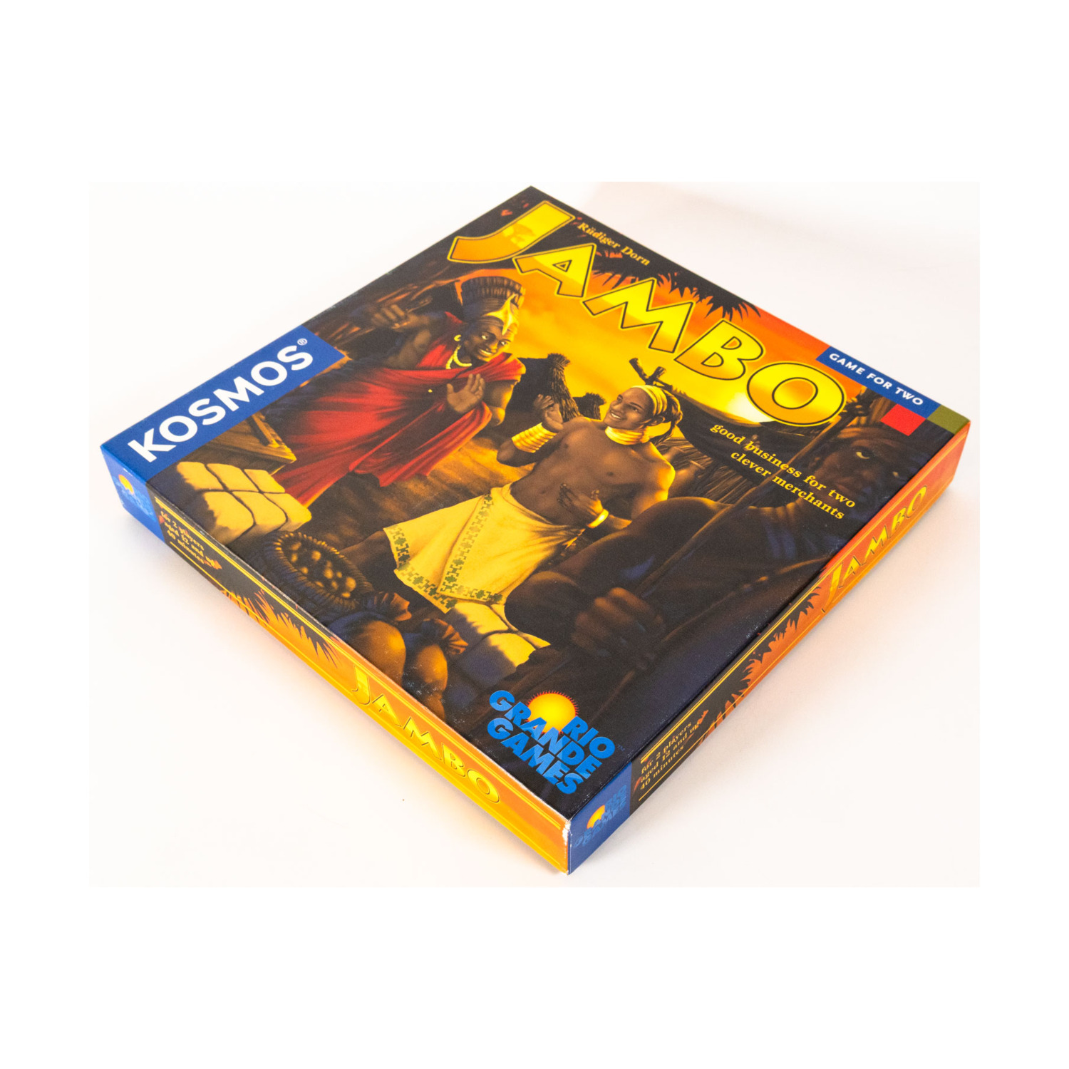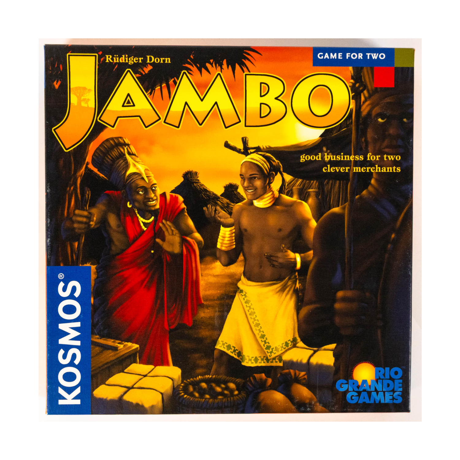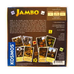 Jambo! is the friendly greeting Swahili traders offered their customers in Central Africa before colonization. The players are traders in this day, competing to be the first to earn 60 gold by selling tea, hide, fruits, salt, silk, and trinkets. The game is played with cards which represent goods, people (which can help you or hinder your opponent), and animals (which add a bit of spice to the game). Players take turns with up to 5 actions per turn until one player reaches the goal and wins the game.