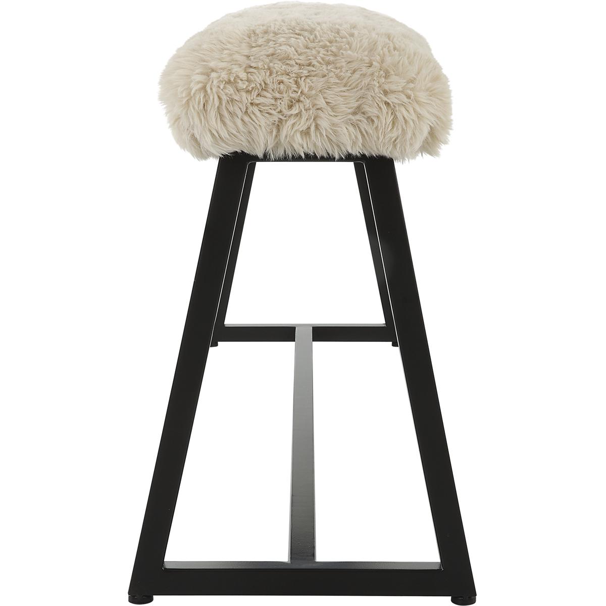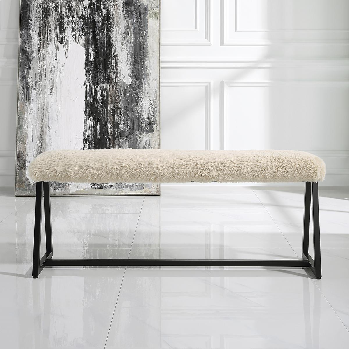 A Space Saving Seating Solution Featuring A Slim Bench Seat Upholstered In Plush Long Haired Faux Sheepskin In A Toasty Beige Over A Matte Black Finished Iron Base. Seat Depth Is 8".