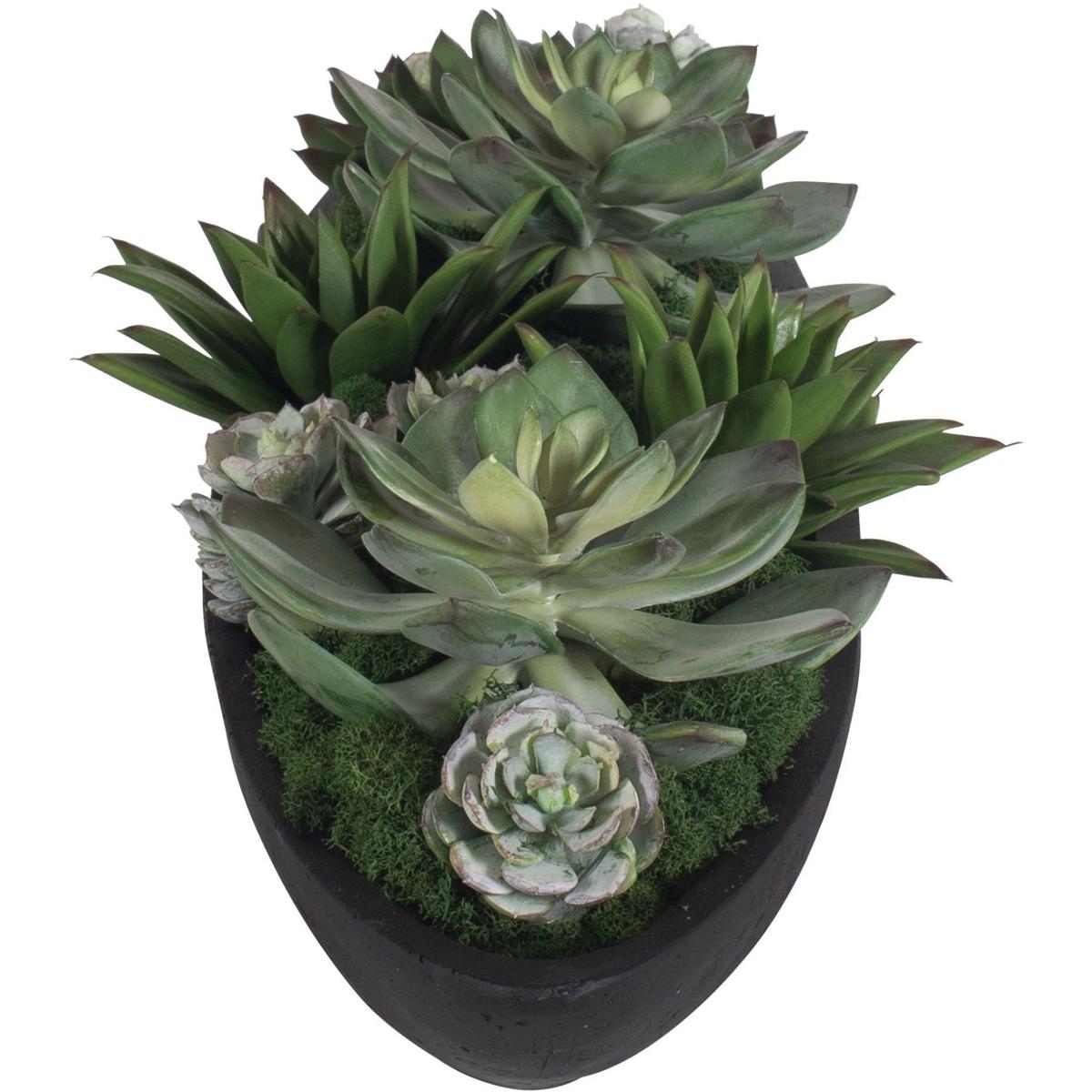 Lush Succulents Nestled Into A Bed Of Reindeer Moss And Displayed In A Cast Black Man-made Stone Boat Container.