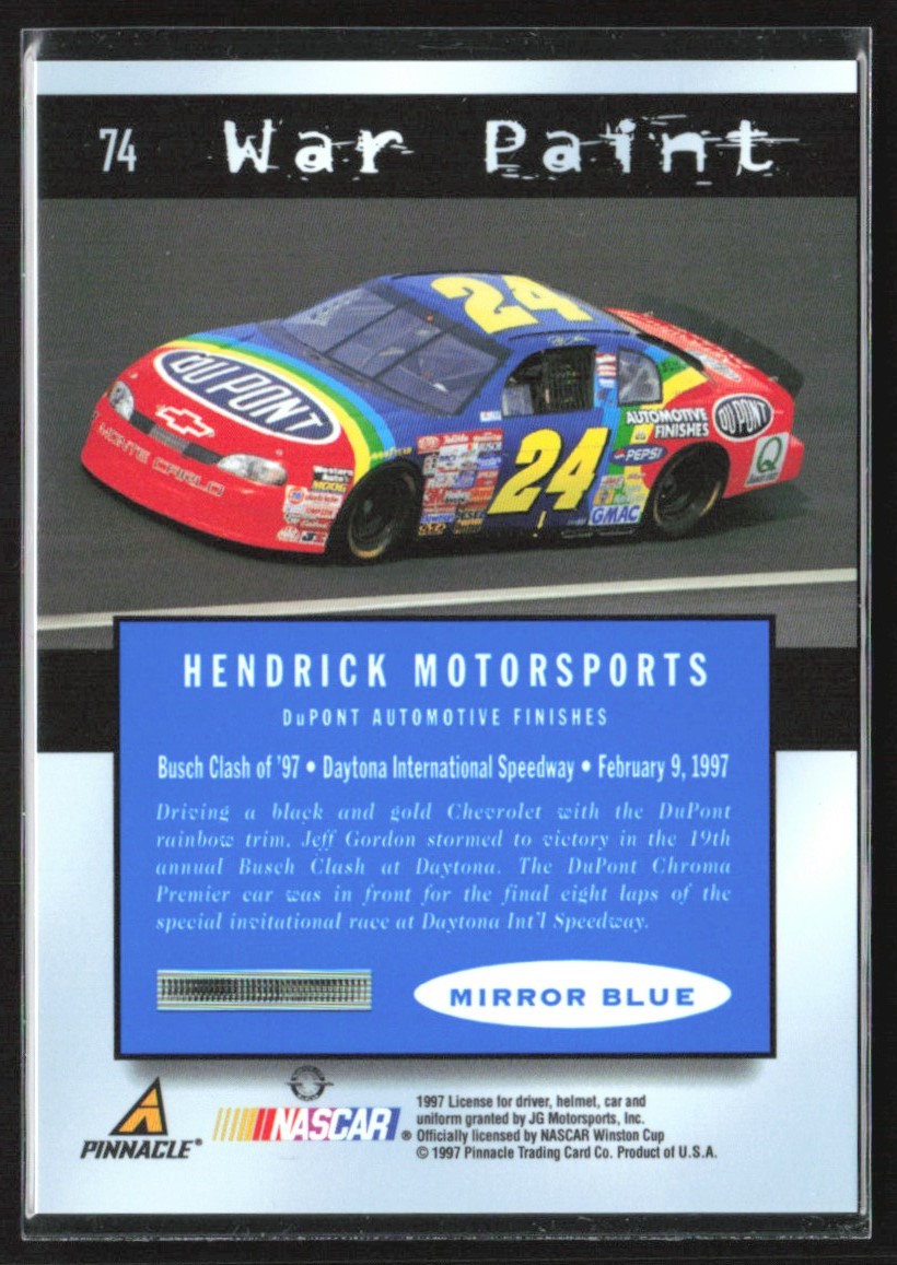 | Description: | Jeff Gordon | | Category: | Racing | | Year: | 1997 | | Product: | Pinnacle Certified War Paint Mirror Blue | | Team: | Hendrick Motorsports | | Card Number: | 74 | | Dimensions: | 3½" x 2½" | | SKU: | RA R0001 R34 W (25) |