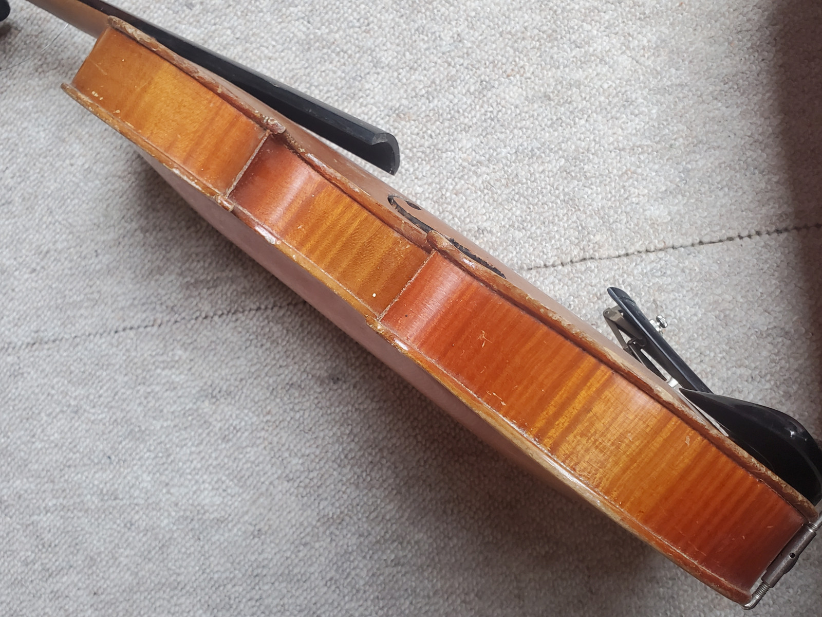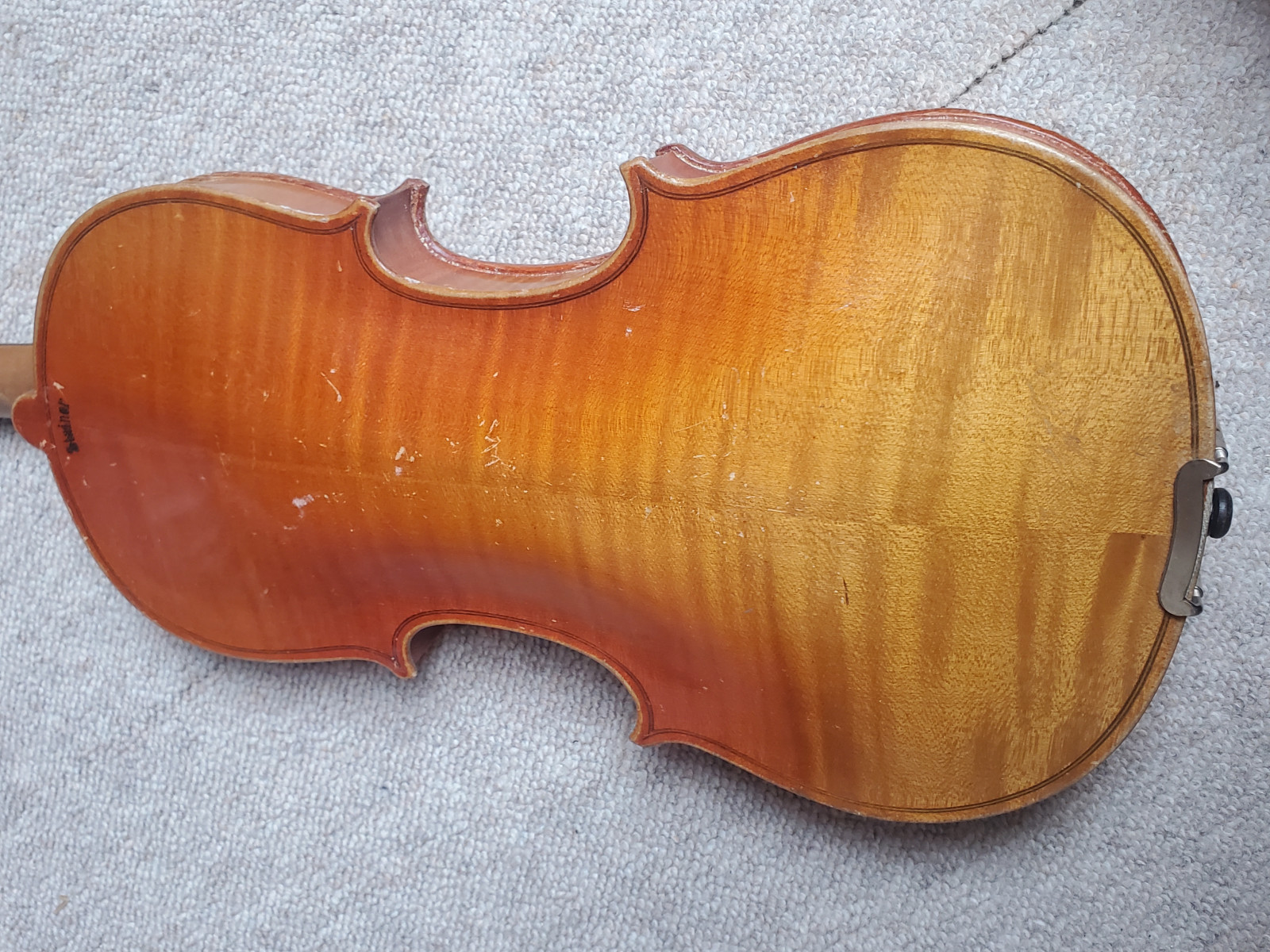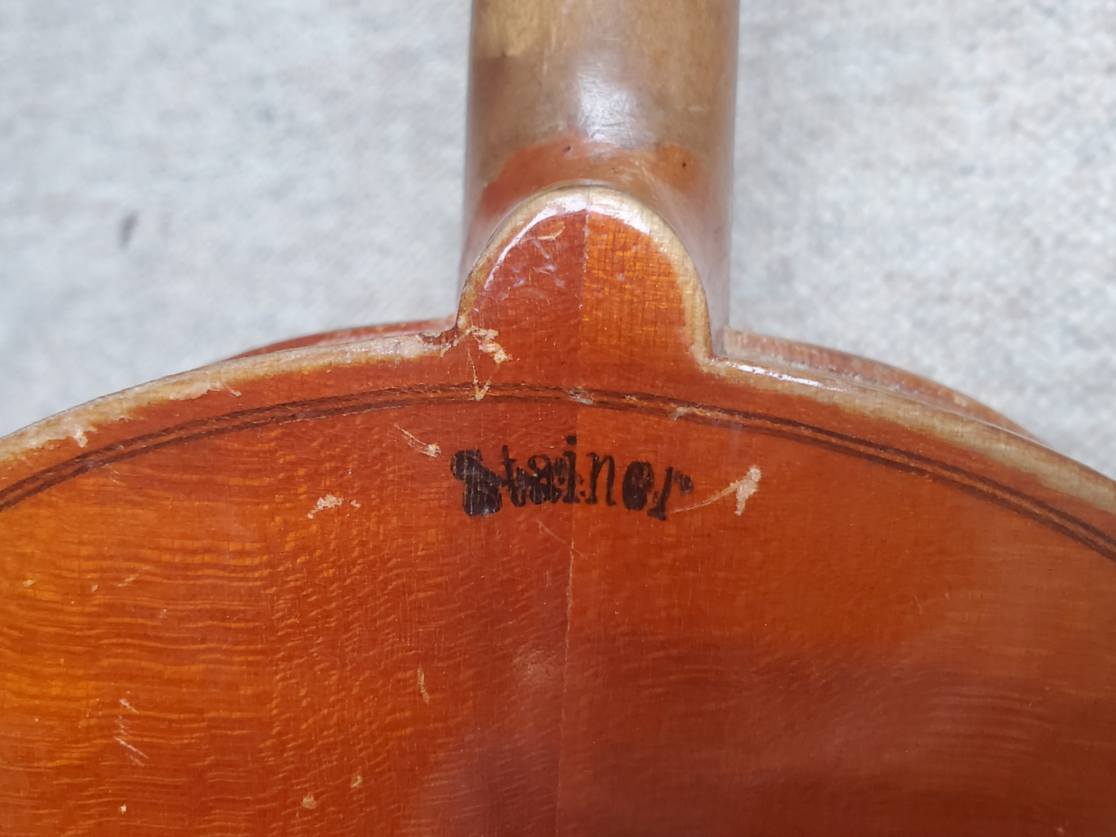 Nicely flamed old 3/4 violin. There is no label inside, but the back of the instrument reads "Stainer" I found no cracks . The length is 55,5cm/ 21 7/8inch. The body is 34cm (13 3/8 inch). Instrument needs cleaning and service. If you have any questions, please ask. Insured shipping to USA or Canada amounts to 59 USD. Please also view my other auctions with instruments. Shipping several violins saves shippingfees.I accept payment via paypal, too. Please see my other auctions with string-, woodwind- and brass instruments.