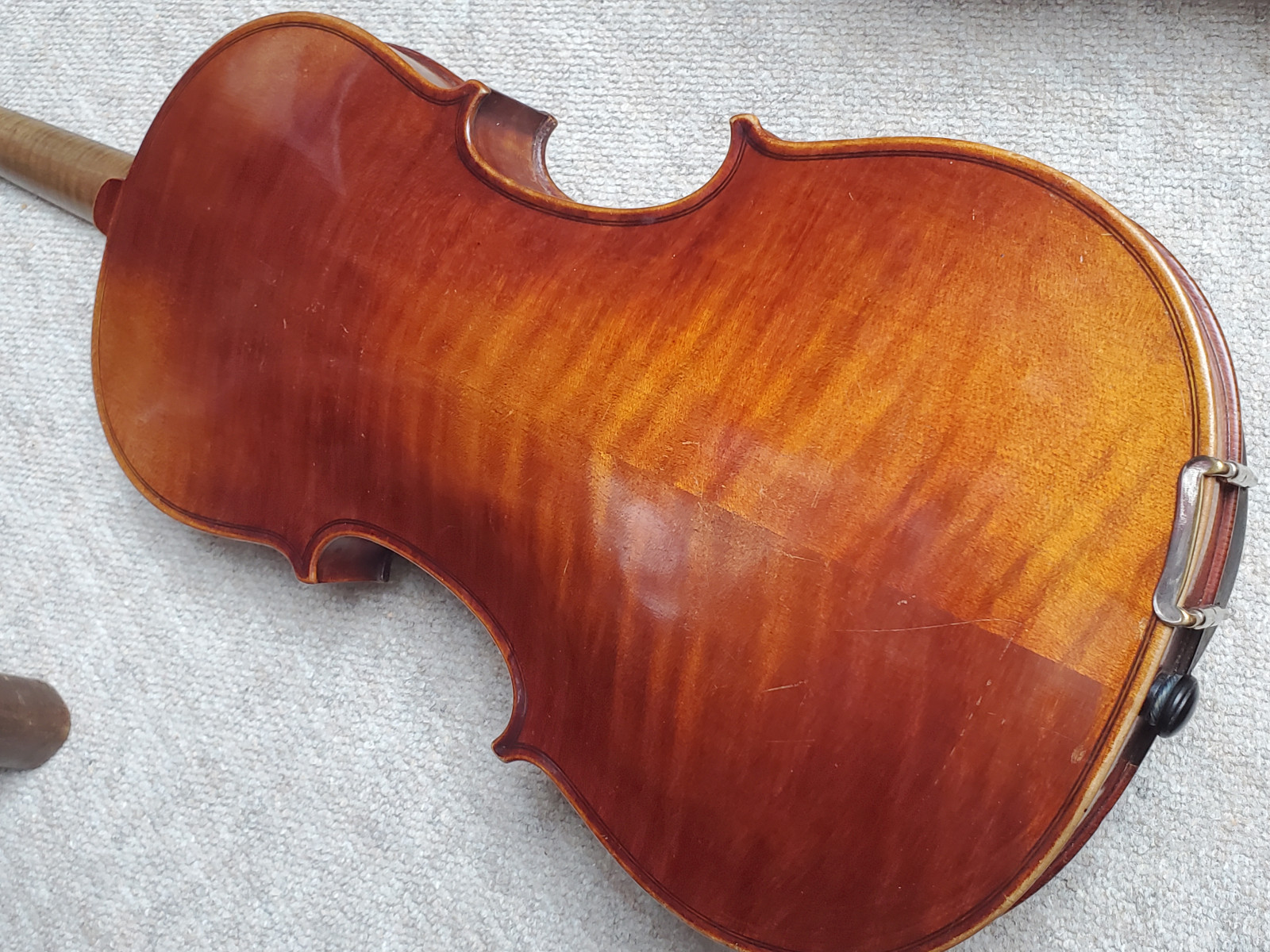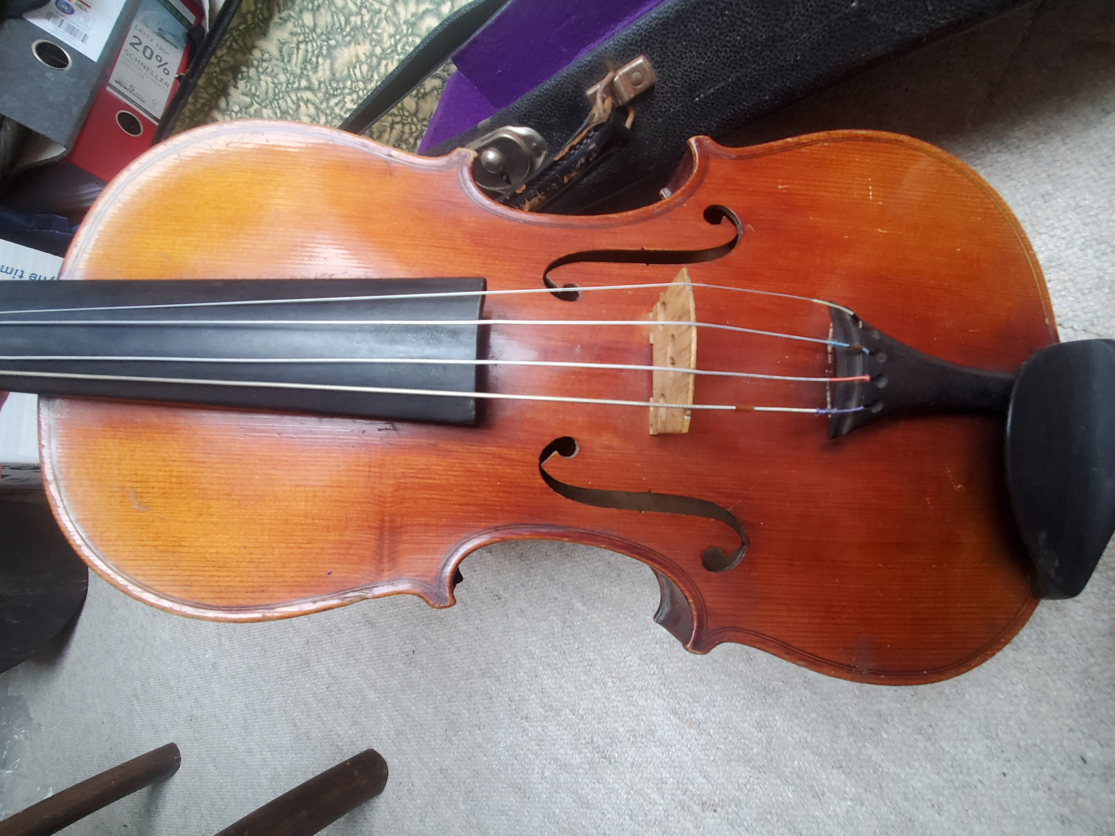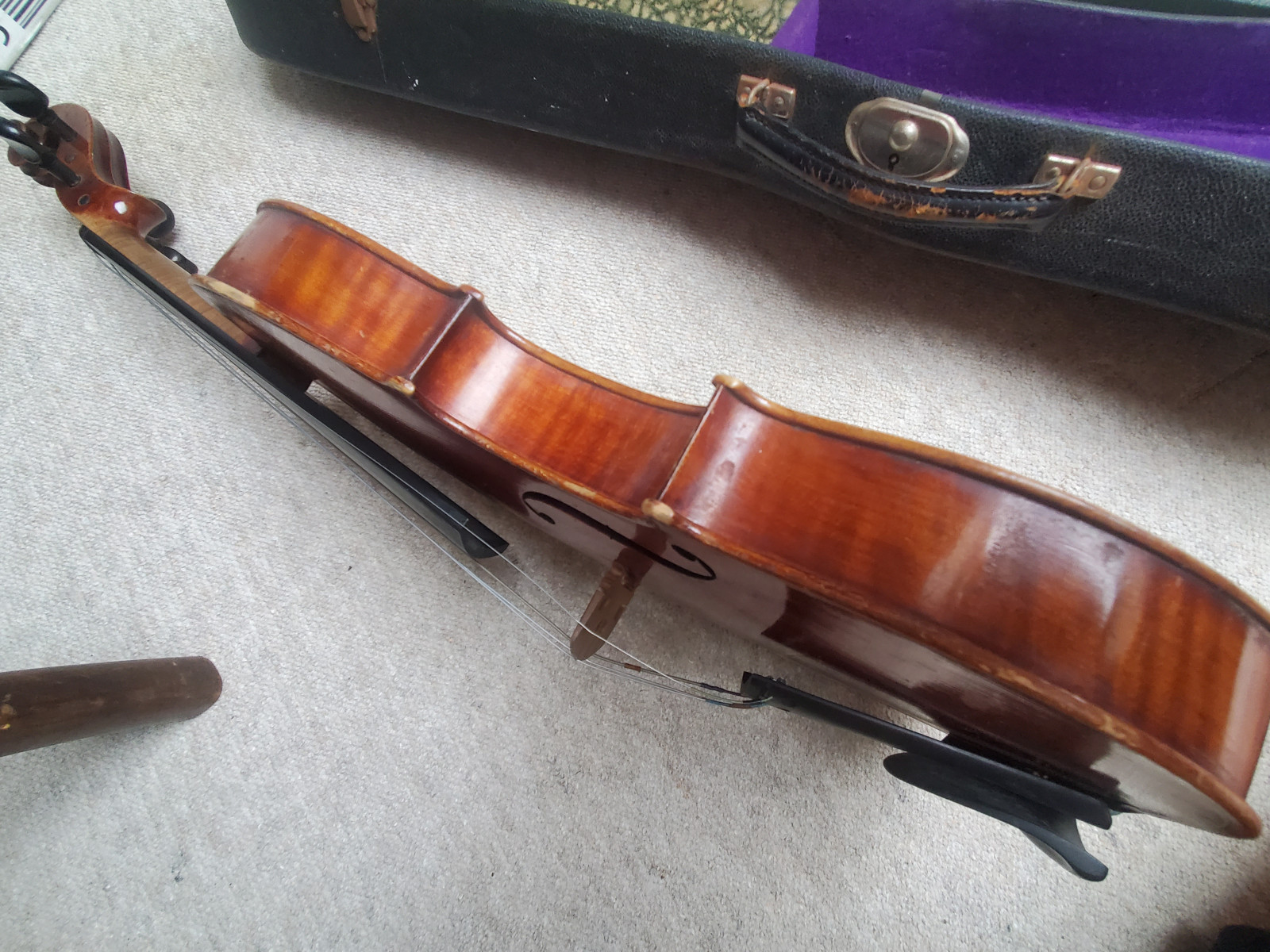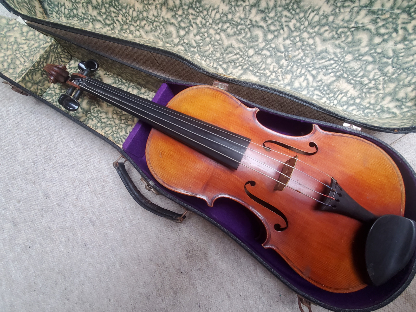 Beautiful old viola with a nicely flamed back. The label inside reads: "Antonius Stradiuarius cremonensis faciebat anno 1762" (The viola is not that old, of course) No cracks, but the front and back are partly a bit loose. (no problem for a repair shop) . So the instrument needs some service and cleaning. The length is 65,5cm/ 25 3/4inch. The body is 39cm (15 3/8inch). Please make sure that you see all the photos UNDER the item describtion! If you have any questions, please ask. Insured shipping to USA or Canada amounts to 75 USD.