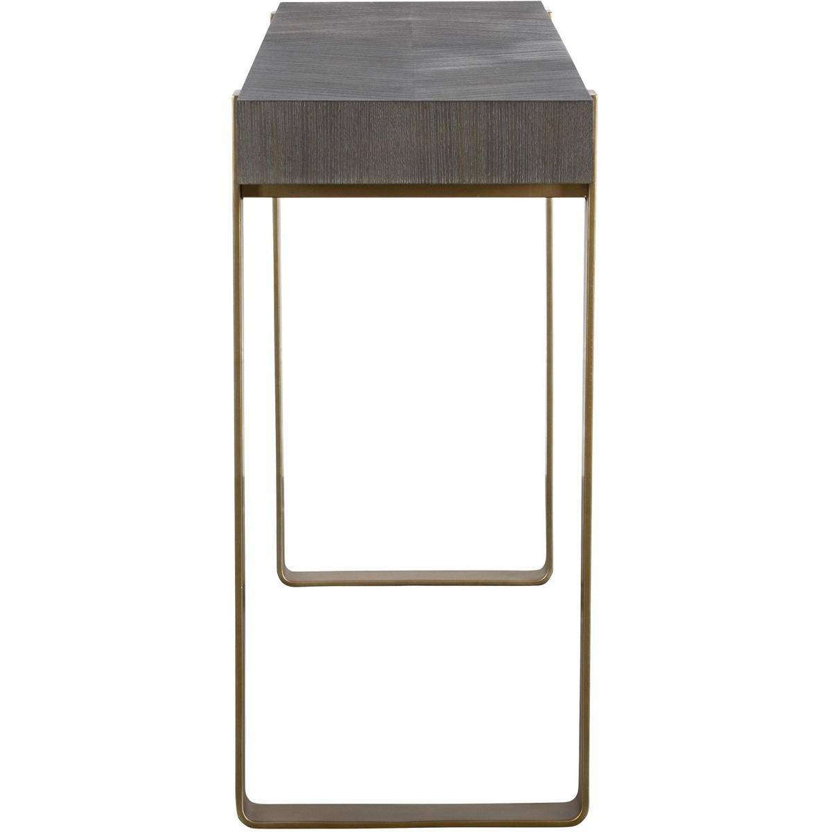 Contemporary In Style, This Console Features A Striking Diamond Ash Veneer Top In A Dark Walnut Stain With Light Gray Glazing. The Iron Strap Legs Are Finished In A Warm Brushed Brass.