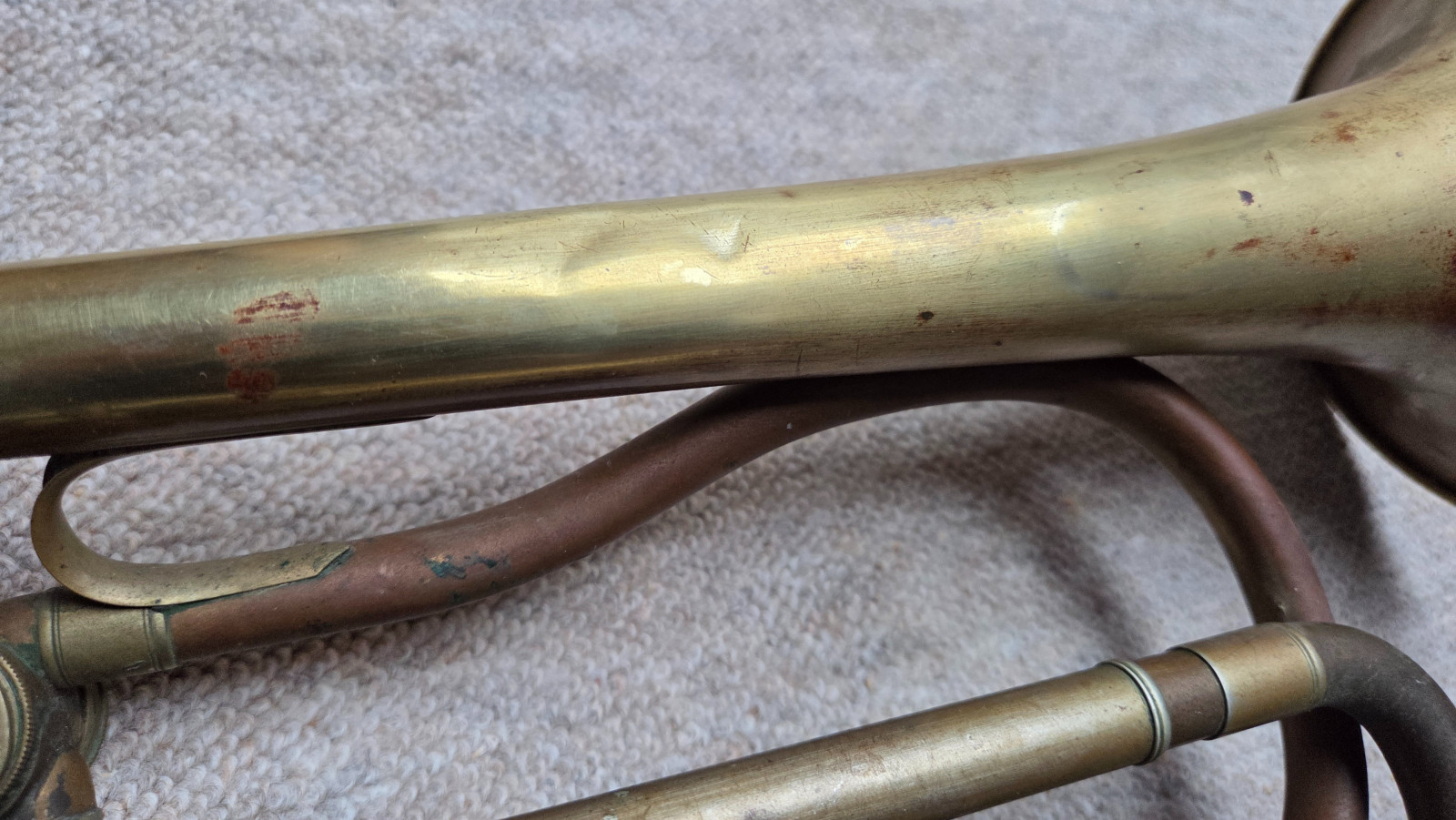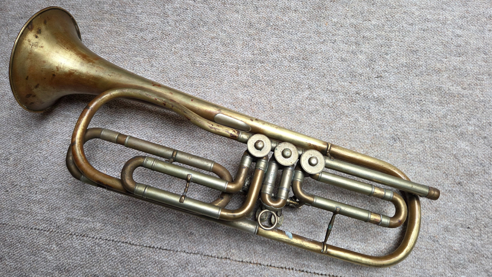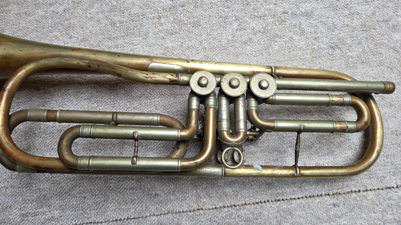 Used rotary trumpet . I dont know the key it plays in (maybe in F or Eb?) No makersname to be found. Size of the horn is approx. 50,5 cm/19 7/8 inch. The tubing from the bell to the beginning of the mouthpice receiver is203cm / 81,5inches long. Bellsize: 13,7cm, aprox.5 3/8 inch. The valves are moving fast and easy, The slides are moveable. The furnish is worn with scretches. Some small dents. The instrument needs service, , cleaning and polish! Please make sure that you see all the photos UNDER the item describtion!