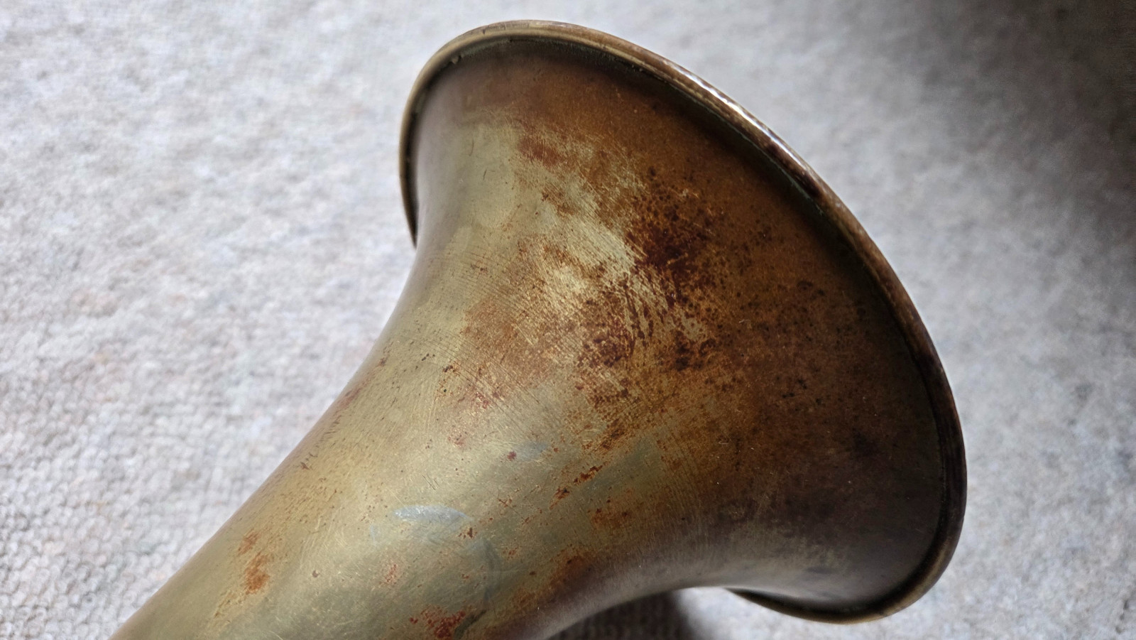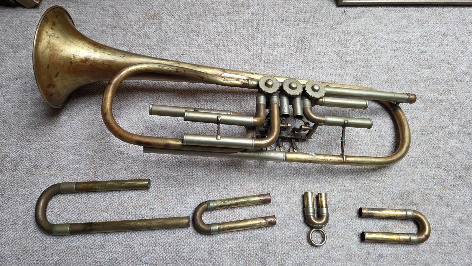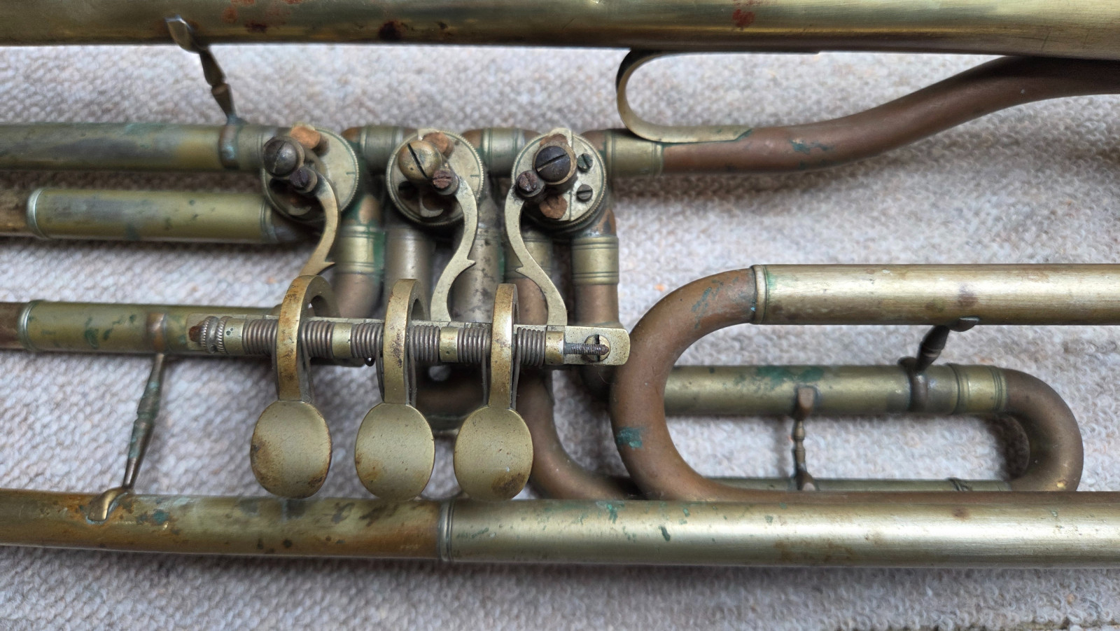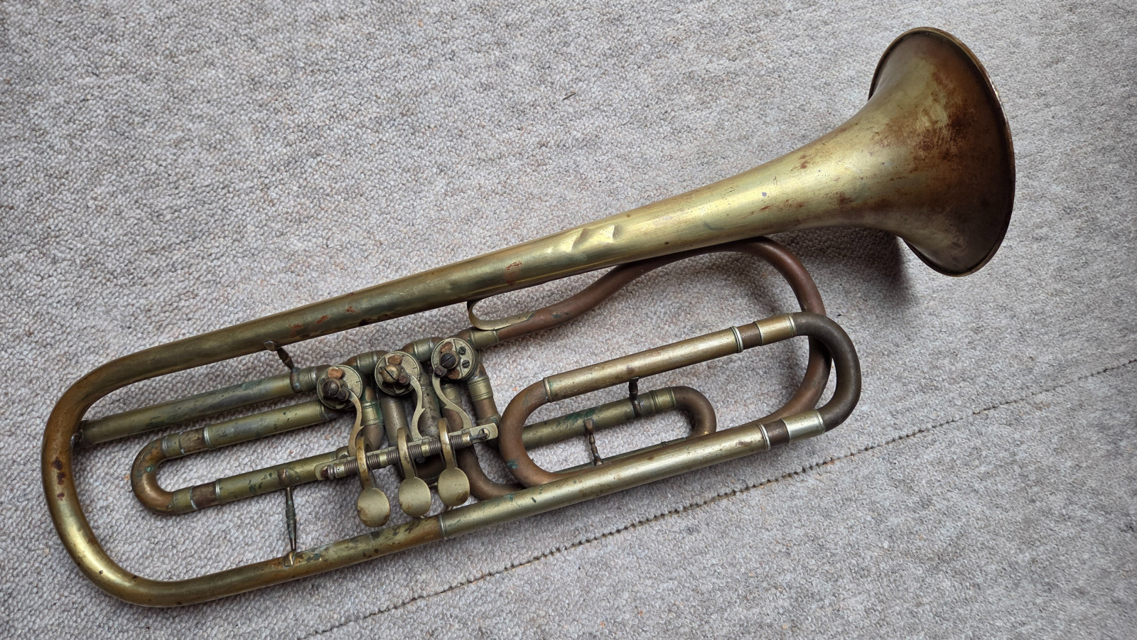 Used rotary trumpet . I dont know the key it plays in (maybe in F or Eb?) No makersname to be found. Size of the horn is approx. 50,5 cm/19 7/8 inch. The tubing from the bell to the beginning of the mouthpice receiver is203cm / 81,5inches long. Bellsize: 13,7cm, aprox.5 3/8 inch. The valves are moving fast and easy, The slides are moveable. The furnish is worn with scretches. Some small dents. The instrument needs service, , cleaning and polish! Please make sure that you see all the photos UNDER the item describtion!